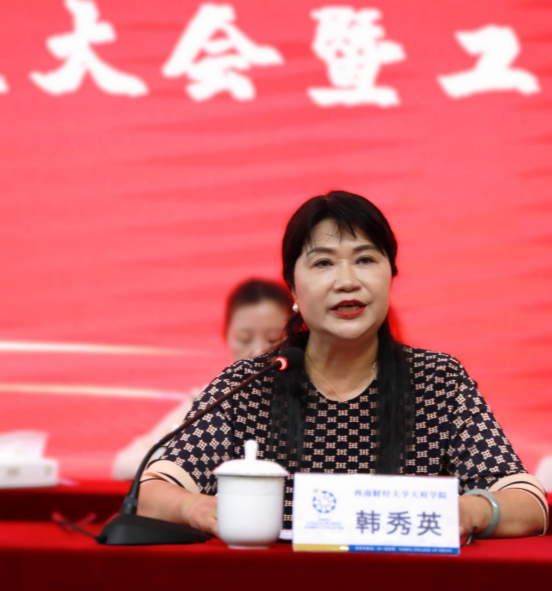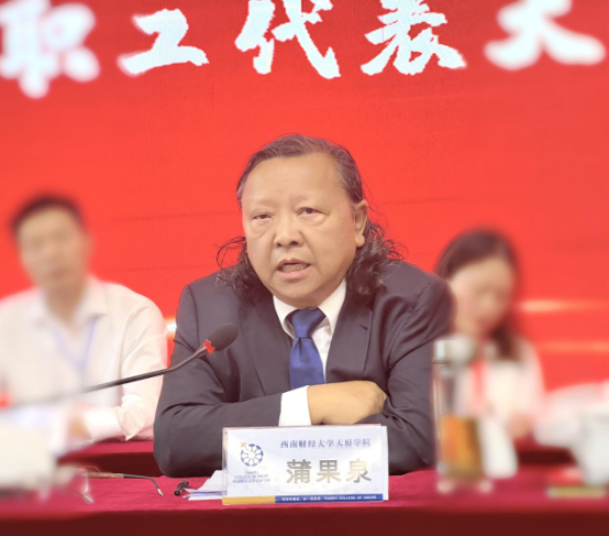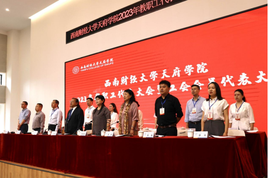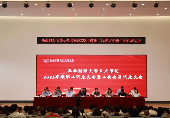 5月5日,西南财经大学天府学院2023年教职工代表大会暨工会代表大会在德阳校区C203报告厅召开,学校校长蒲果泉,学校党委书记、省政府督导专员韩秀英,常务副校长黄纯国,副校长、工会主席孟虹,党委副书记管勇,党委副书记、副校长袁勋,副校长张之明、钟成、姚一永、苟兴才、刘强出席了大会,教职工代表、工会会员代表和列席代表参与会议,会议由孟虹主持。