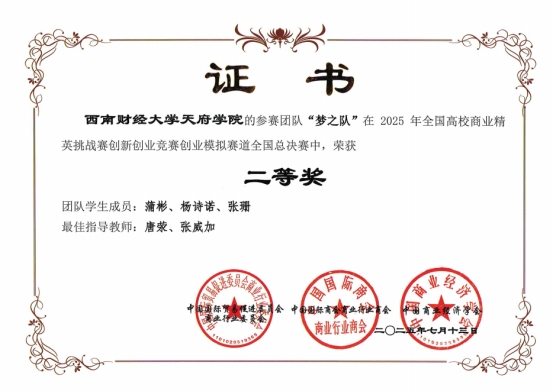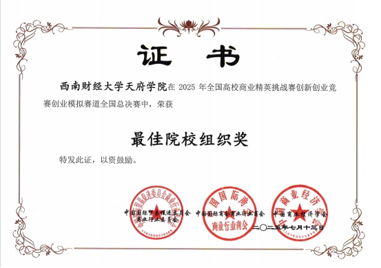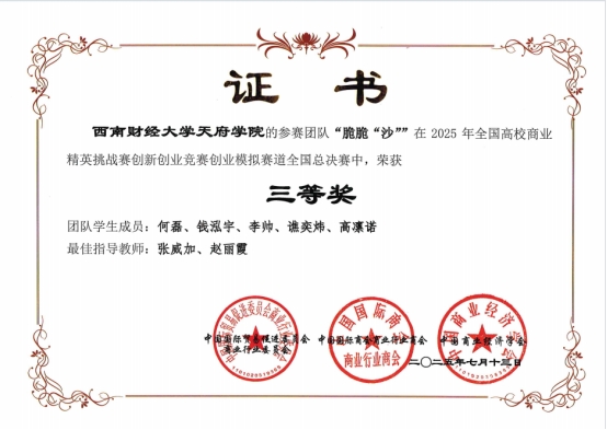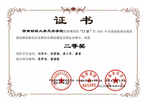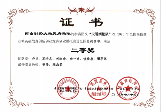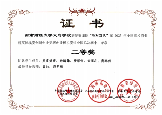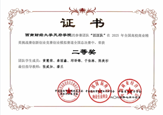 由中国国际贸易促进委员会商业行业委员会牵头,会同有关专业协会(学会)和事业单位联合主办的2025年全国高校商业精英挑战赛创新创业竞赛“精创教育杯”创业模拟赛道全国总决赛落下帷幕。全国高校商业精英挑战赛创新创业竞赛是由中国国际贸易促进委员会商业行业委员会主办的国家级学科竞赛活动。根据2023年3月由中国高等教育学会高校竞赛评估与管理体系研究工作组发布的《全国普通高校大学生竞赛分析报告》竞赛目录,全国高校商业精英挑战赛创新创业竞赛再次纳入学科竞赛排行榜,并被认定为我校二类竞赛项目。本次比赛中,西财天府学院现代管理学院、会计学院和智能金融学院的8个团队凭借扎实的专业知识、卓越的实践能力,不畏困难、通力合作,经过近4个小时的激烈角逐,最终斩获国赛二等奖6项、三等奖2项,学校获得最佳院校组织奖。