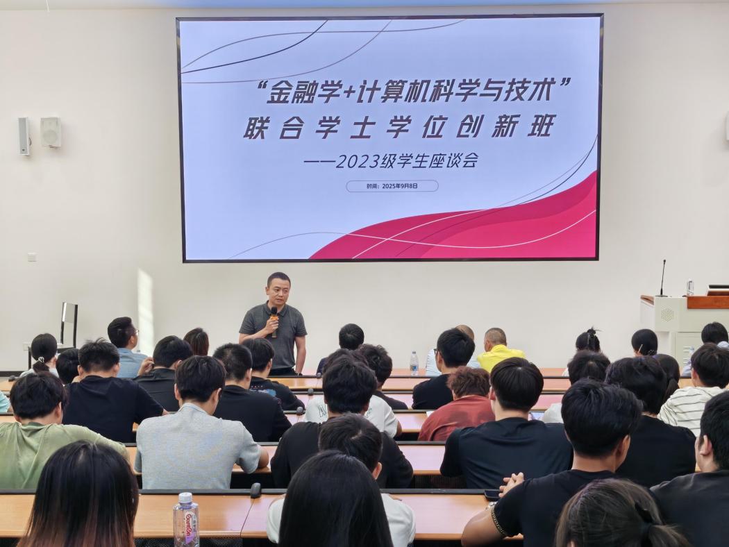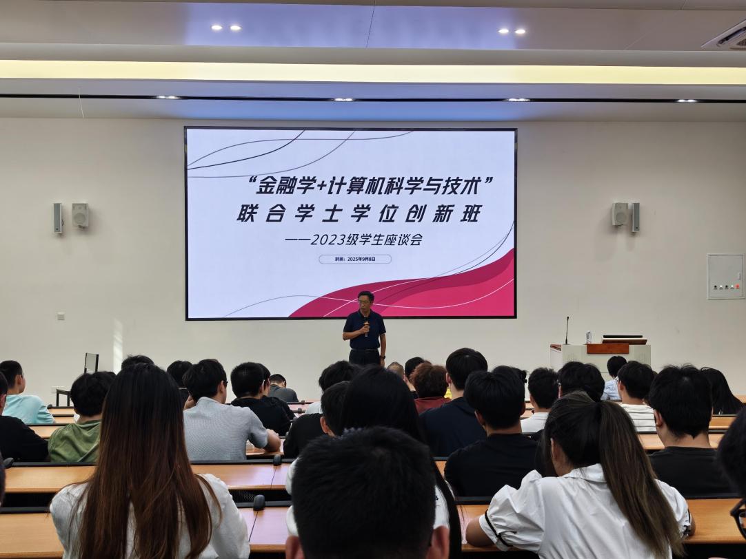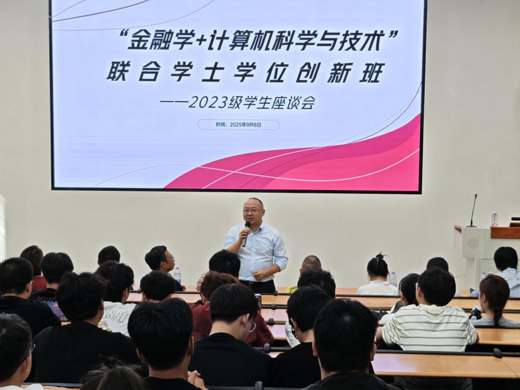 彭光辉结合专业特色提醒同学们,要充分运用“金融+计算机”的交叉学科优势,在学习中注重两类专业知识的融合思考与实践应用,在升学、就业等发展路径中凸显核心竞争力,切实将专业优势转化为个人发展优势。唐黎则围绕学生未来规划提出建议,鼓励大家以“目标导向”积极参与各项专业活动,通过实践成果展现学习成效,证明自身综合素养与专业能力。