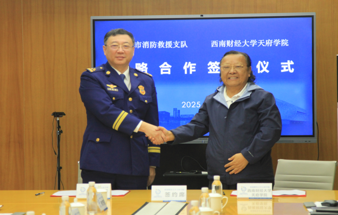 10月13日,西南财经大学天府学院与成都市消防救援支队举行战略合作签约仪式。双方以产学研深度融合为导向,整合各自资源,共同探索消防人才培养与科技创新的新模式,合作共建西财天府消防学与消防科技产教融合创新应用中心,推动消防事业高质量发展。