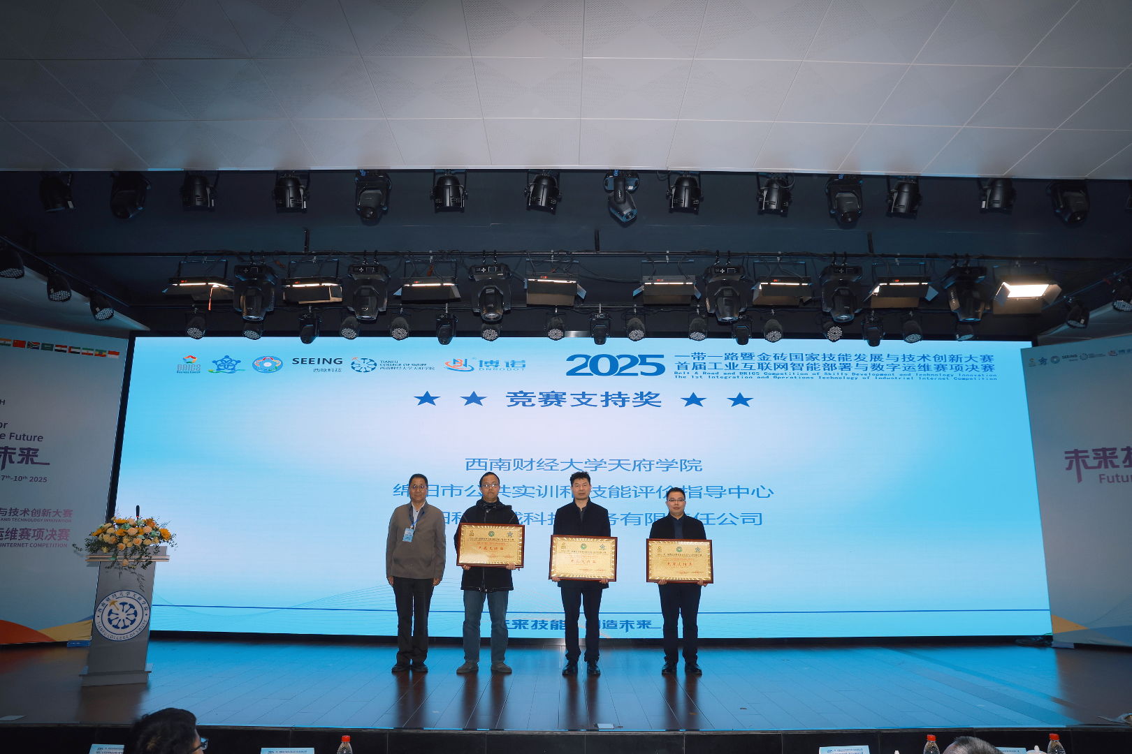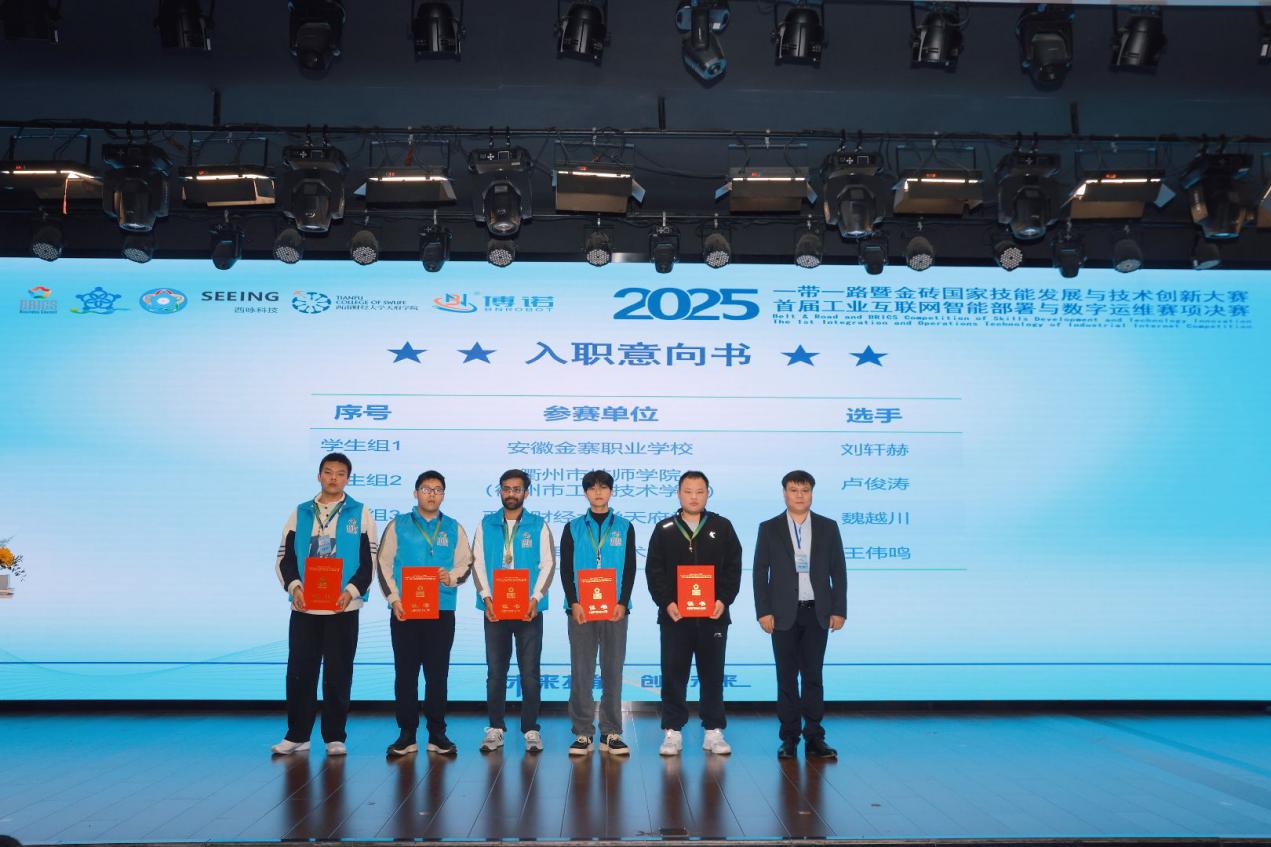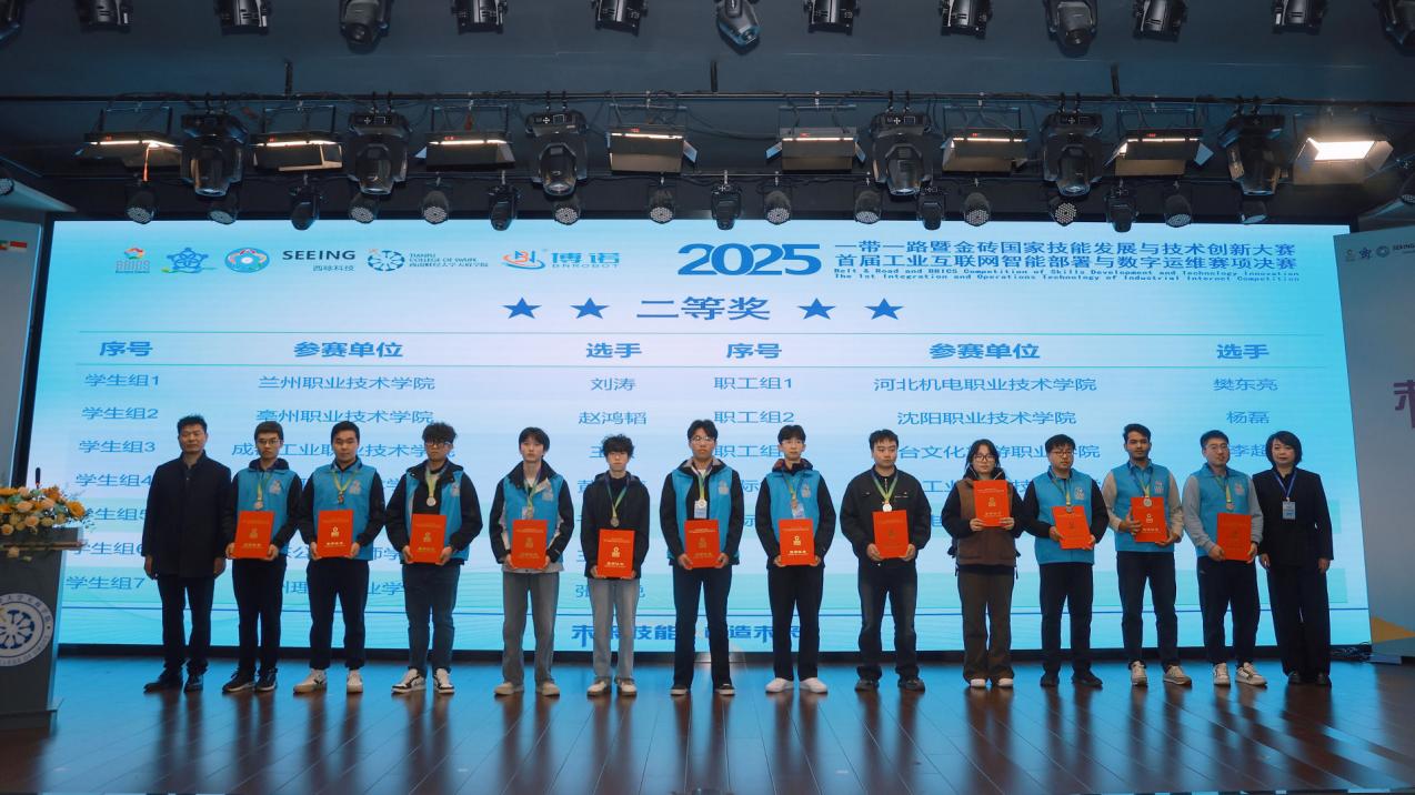 11月10日,2025“一带一路”暨金砖国家技能发展与技术创新大赛之首届工业互联网智能部署与数字运维赛项决赛闭幕式暨颁奖仪式在西南财经大学天府学院举行。经过2天的激烈角逐,来自国内外多所院校及单位的参赛选手圆满完成所有赛程,各大奖项全部决出。
