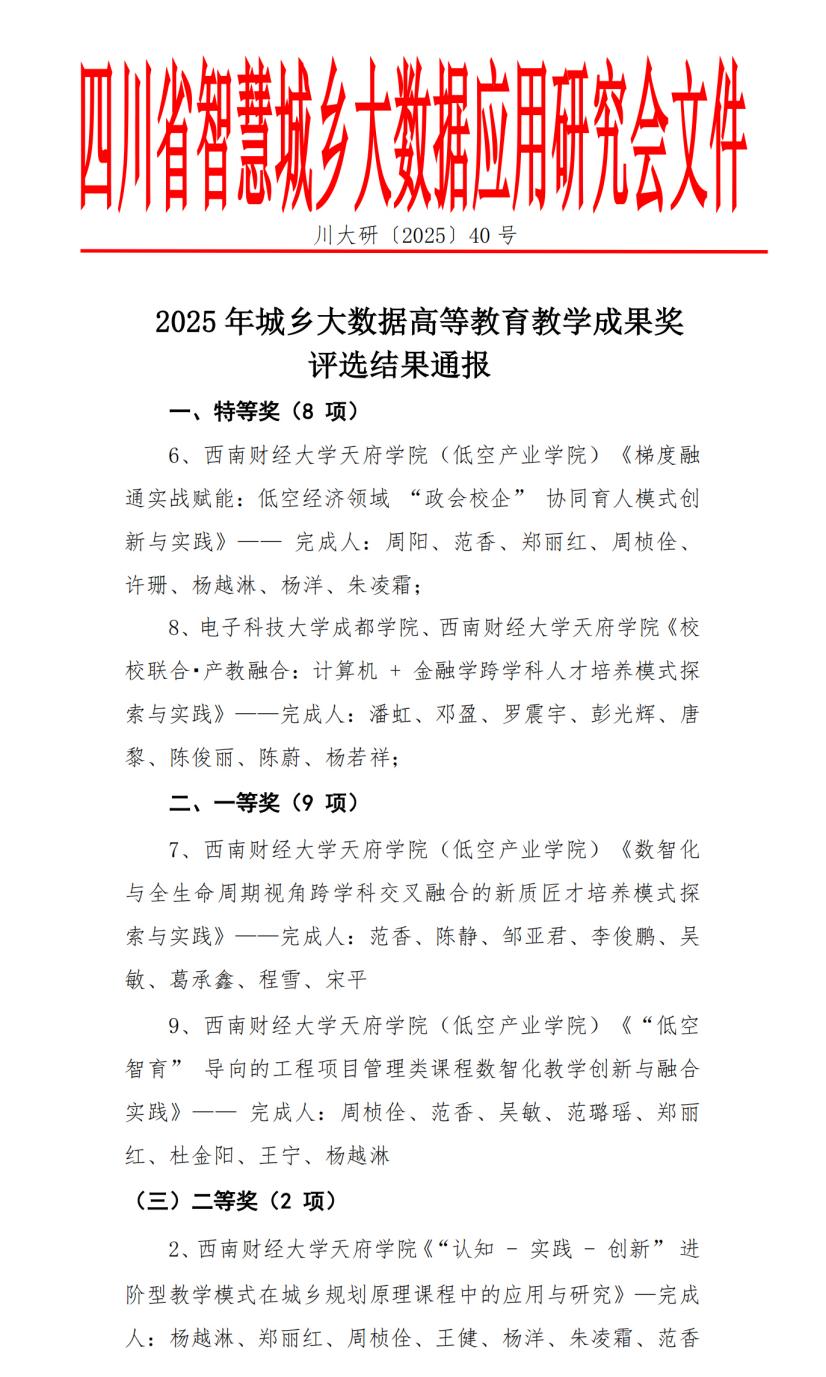 近日,由四川省智慧城乡大数据应用研究会(AAAA级全省性社会组织,属学术性“川渝一流学会”交叉学科科技社团组织)主办的2025年城乡大数据高等教育教学成果奖评选活动圆满落幕。本次评选活动聚焦智慧城乡大数据相关领域教育教学改革创新,旨在推动人工智能、低空技术、数字教育等多领域高等教育高质量发展。活动自启动开始,共接收来自电子科技大学、西南石油大学、西华师范大学等高校的有效申报项目49项,经资格审查、专家评审、集体研究等严格流程,最终评选出特等奖8项、一等奖9项、二等奖2项。西南财经大学天府学院凭借在跨学科融合育人、数智化教学改革、产教协同创新等领域的突出实践,斩获特等奖2项、一等奖2项、二等奖1项,获奖数量与质量均位居全省高校前列,充分彰显了学校在新型数字城乡大数据相关领域的教育教学改革成效与示范作用。