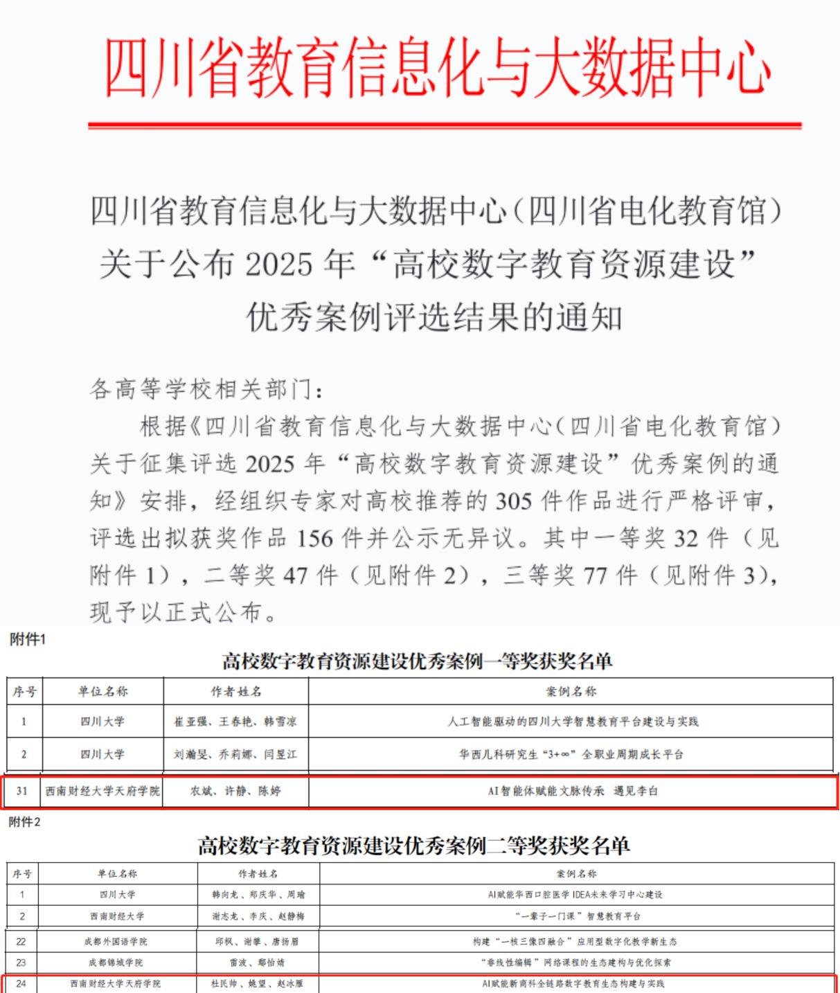 近日,四川省教育信息化与大数据中心公布了2025年“高校数字教育资源建设”优秀案例获奖名单,本次评选由教育厅面向全省高校统一组织开展。西财天府学院在全省高校的激烈角逐中脱颖而出,一举斩获一等奖、二等奖各一项,综合获奖质量和数量为民办第一,彰显了学校在数字教育转型与内涵式发展道路上的坚实步伐与硬核实力。