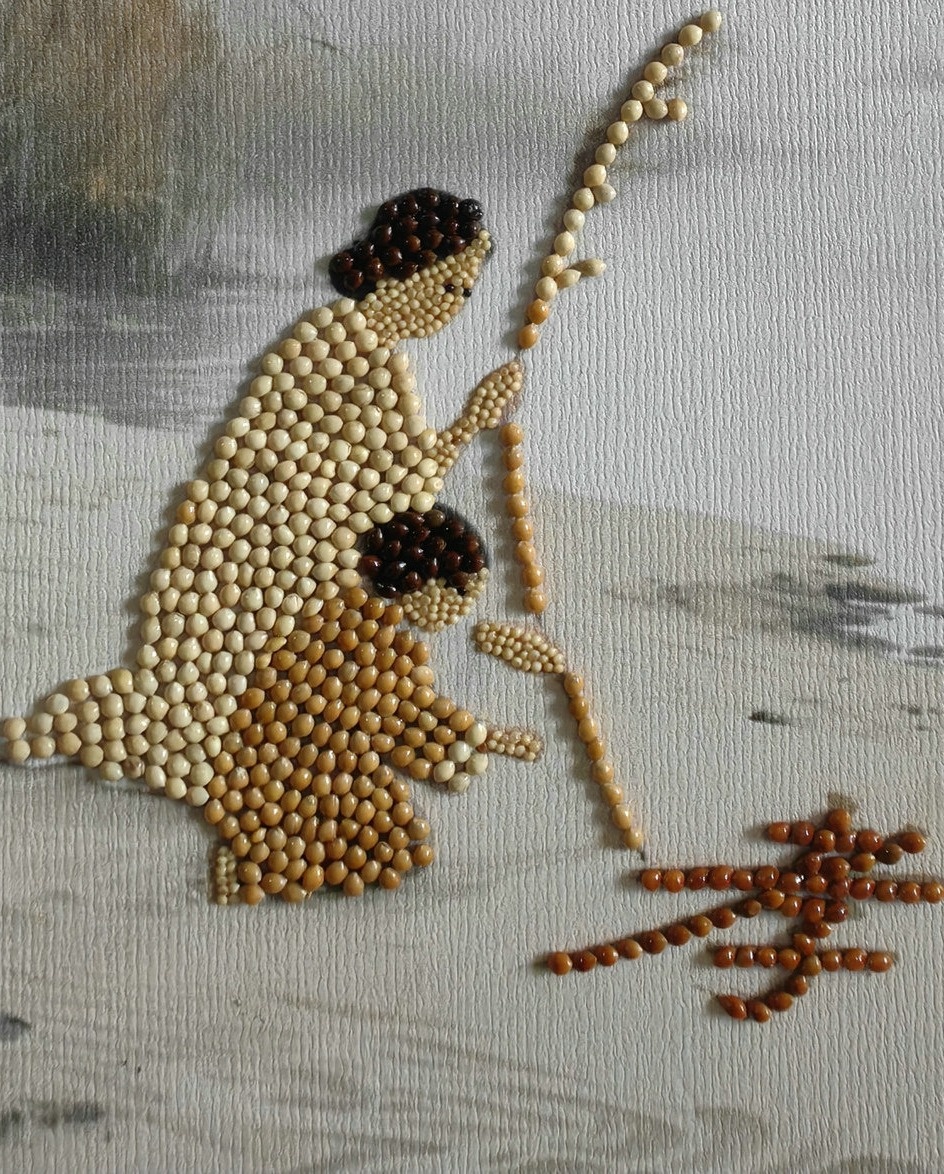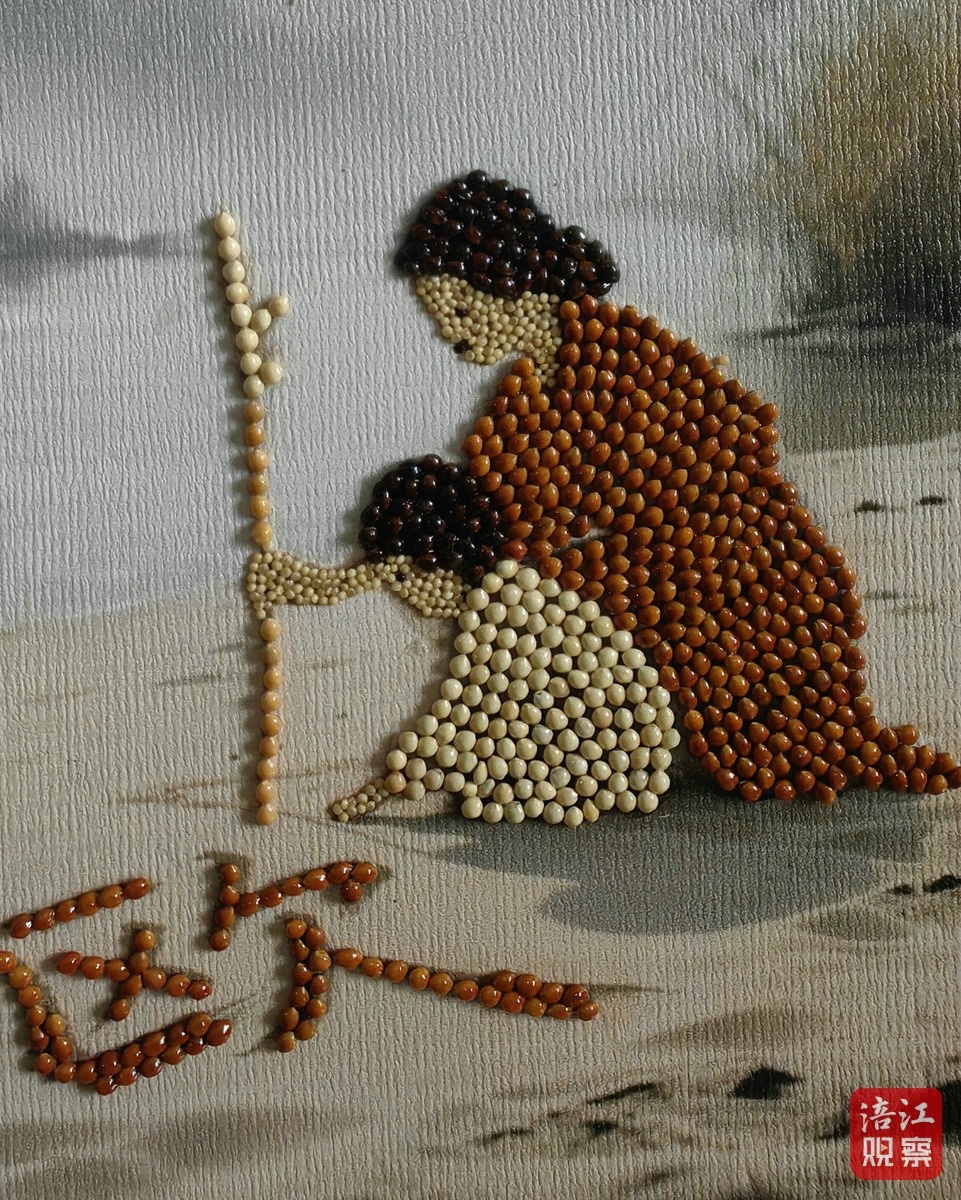 校友罗彩菊看到尹海燕的作品,感觉“心里被某种东西抓住了”。一个周末,两人相约前往丰谷镇。罗彩菊老家在农村,从小见过很多植物种子,但在鑫田粮艺传习所,她才发现自己的孤陋寡闻,“我看到了好多以前闻所未闻的种子”。更让罗彩菊惊奇的是,那些“看起来渺小的种子,竟然可以拼出画来”。