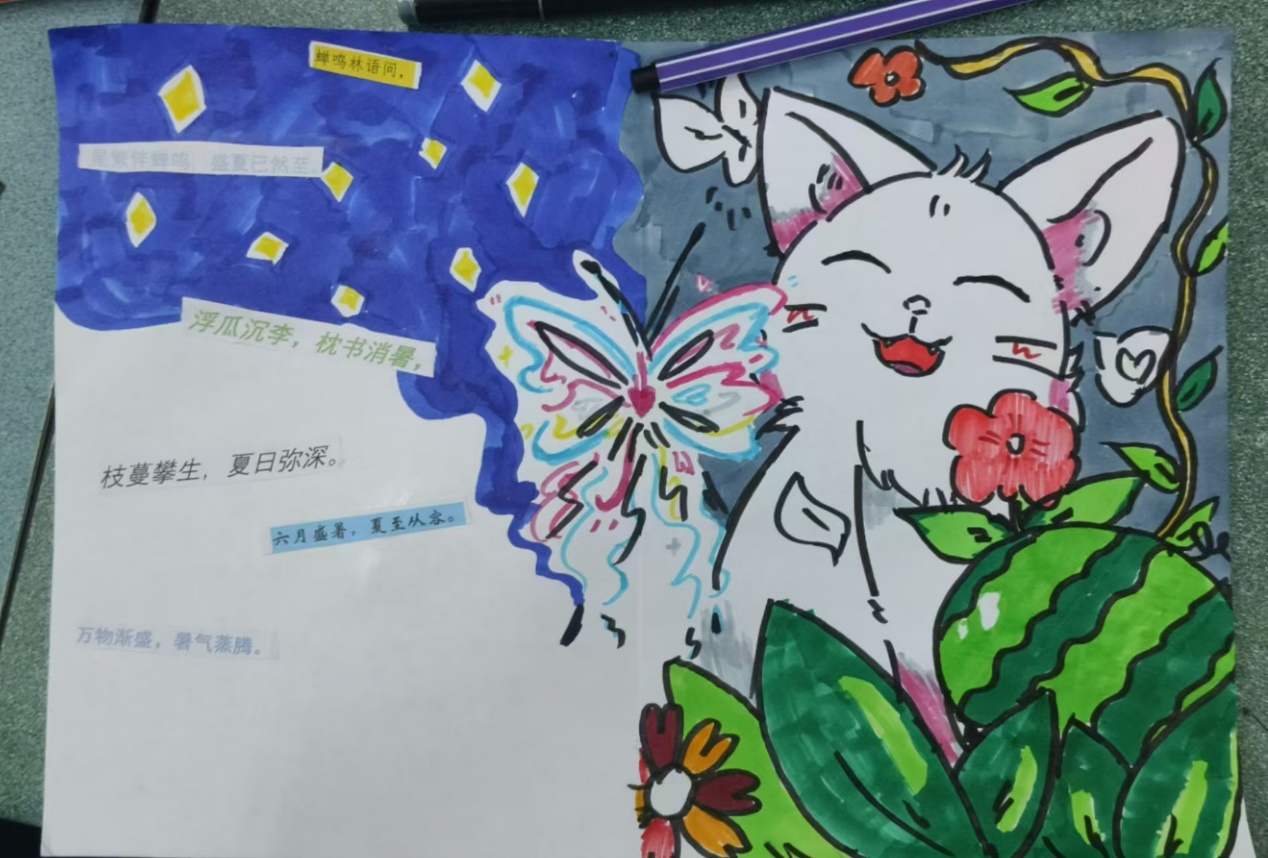 诗歌是中华民族传统文化的重要组成部分,通过拼接诗歌活动,学生可以更好地感受、传承中华优秀传统文化。本次活动,参与学生首先组成不超过四个人的队伍,然后由成员合作完成拼接、写作、绘画,最后在卡纸上呈现一首完整的夏日诗歌。