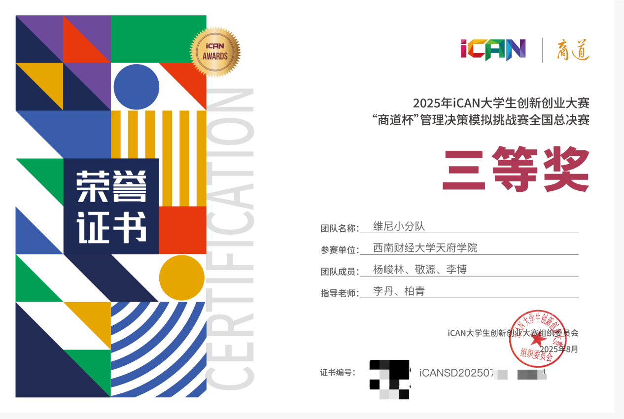 近日,2025年iCAN大学生创新创业大赛“商道杯”管理决策模拟挑战赛落下帷幕。该比赛由iCAN大学生创新创业大赛组织委员会主办,2023年列入中国高等教育学会发布的《全国普通高校大学生竞赛分析报告》竞赛目录【赛项序号54】,通过选拔,西财天府学院会计学院及现代服务管理学院共16支队伍进入省赛,其中一支队伍晋级参加全国总决赛,最终荣获全国三等奖1项,省级一等奖1项,省级二等奖5项,省级三等奖8项,会计学院杨益、杨卓、李丹、柏青老师荣获省级优秀指导老师。