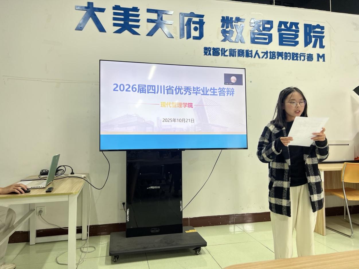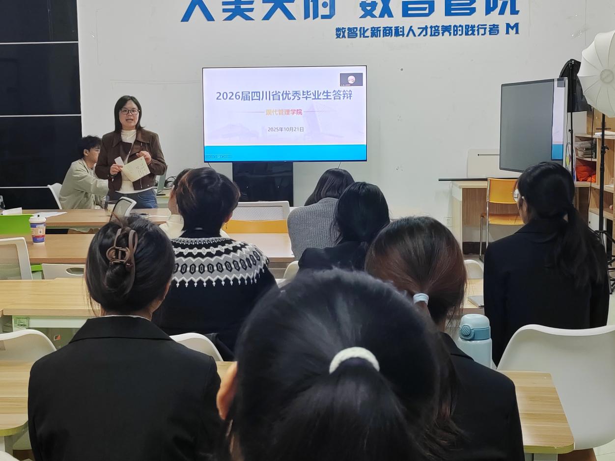 为深入贯彻落实立德树人根本任务,充分展示当代大学生勤奋好学、锐意进取的精神风貌,现代管理学院于10月21日下午在绵阳校区B6-1举行2026届四川省优秀毕业生答辩会。答辩评审团由学院分党委书记倪娅、副书记潘兰及全体辅导员共同组成,共有26名优秀学子参与此次答辩。