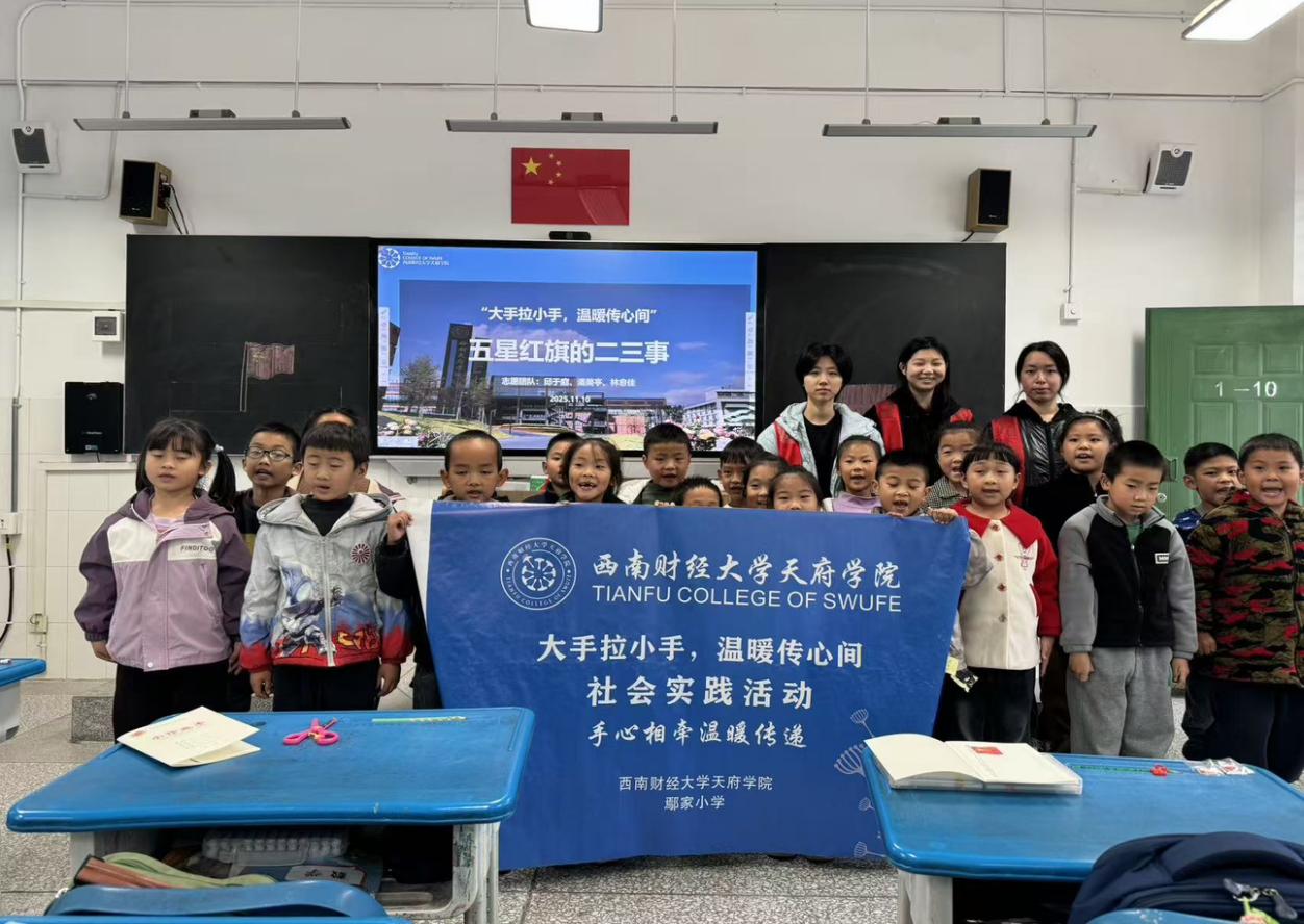 旗帜引领方向,红星照亮童心。11月10日,西南财经大学天府学院德阳校区第一学生社区的支教团队走进鄢家小学,开展一场以“五星红旗的二三事”为主题的爱国主义支教活动。本次活动旨在通过生动有趣的讲解与互动,引导孩子们认识国旗、理解国旗、守护国旗,在幼小的心灵中深植爱国情怀。