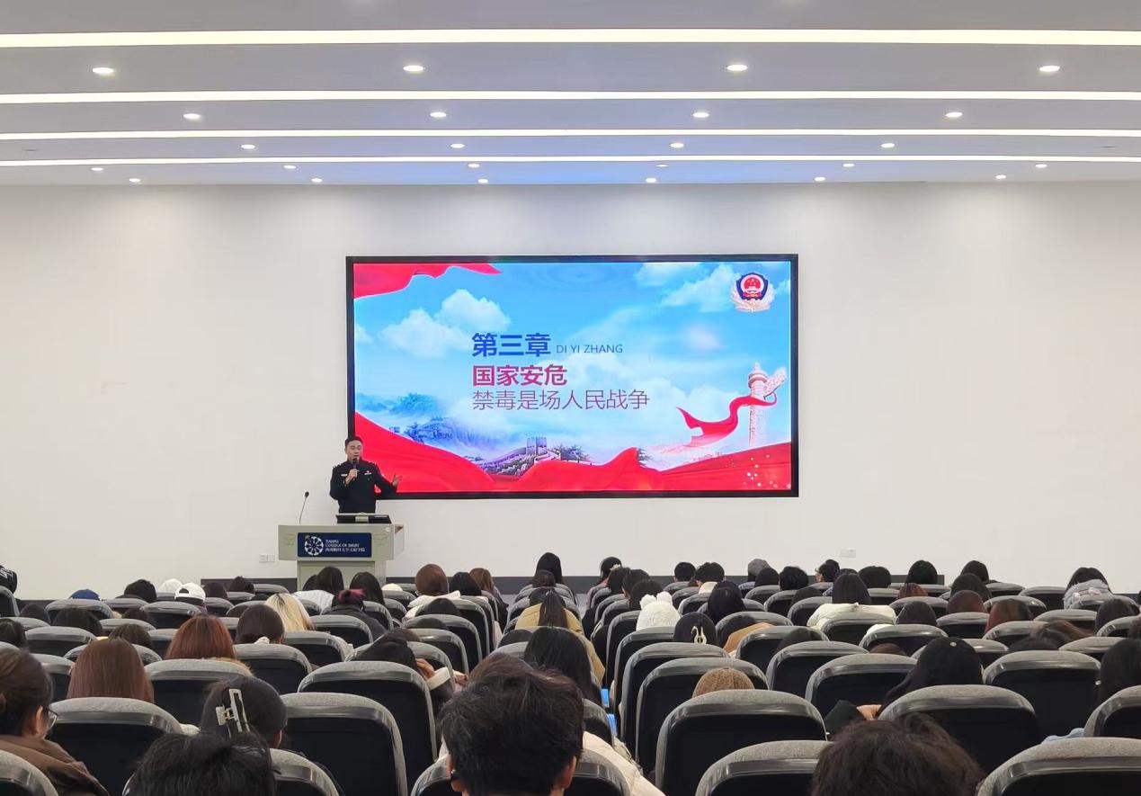 随后,谭淞鹏通过详实的数据、典型的案例,清晰展现了当前禁毒工作的严峻形势。他指出,随着禁毒力度的加大,毒品犯罪的隐蔽性、伪装性不断增强,新型毒品层出不穷,给禁毒工作带来了新的挑战。针对青少年群体好奇心强、社会经验不足、交友不慎等易涉毒诱因,谭淞鹏着重讲解了禁毒知识的核心要点。他不仅介绍了海洛因、冰毒等传统毒品的危害,更重点拆解了“毒奶茶”“上头电子烟”“邮票毒品”等新型伪装毒品的种类特征与识别方法,提醒同学们警惕身边“披着合法外衣”的毒品陷阱。同时,谭淞鹏深入剖析了青少年涉毒的核心诱因,告诫大家要树立正确的交友观,摒弃好奇心作祟的侥幸心理。