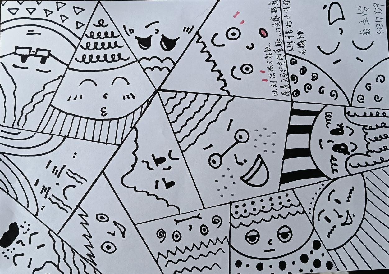 活动现场洋溢着温馨活泼的氛围,同学们纷纷执笔挥墨,将内心的喜悦、忧伤、焦虑与安宁一一投射于色彩与文字之间。画布上,线条勾勒出情感的轮廓;手抄报中,图文记录情绪的流转;散文里,字里行间透露着对自我的觉察与接纳。这里没有评判与说教,只有倾听与共鸣。每份作品附上的情绪解读,不仅是创作者对内心的梳理,也成为连接他人情感的温柔纽带。文化与教育学院杨金兰同学的作品以明快的圆形构图,搭配“一念自在,一念自得”的文字,将情绪的流转与心境的自洽具象化,暖色与沉稳色块交织碰撞,传递出“境随心转”的从容态度。翁立怡同学则通过几何分割的黑白线条,铺展神态各异的卡通形象,细腻笔触下涌动鲜活的情感表达,展现出年轻一代对内心世界的生动解构。活动接近尾声时,商业街的展板上已贴满缤纷各异的“情绪调色盘”。初冬晚风微凉,而这些真挚热烈的表达,却让空气里浸润着一片松弛的暖意。