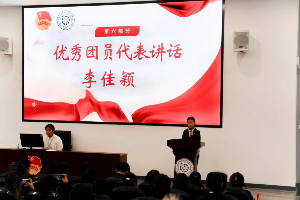 全体宣誓后,新发展团员代表乔雨霏发言,承诺将砥砺政治品格、淬炼专业能力、培育良好作风,以青春之担当践行入团誓言,于守护人民健康与推动民族复兴的征程中焕发光彩。优秀团员代表李佳颖结合“一二·九”运动90周年的历史,向新团员表达祝贺与期望,分享“成为信仰坚定的举旗者、本领过硬的筑梦人、文明新风的引领者”的感悟,号召团员传承爱国精神,于奉献中展现青春风采。