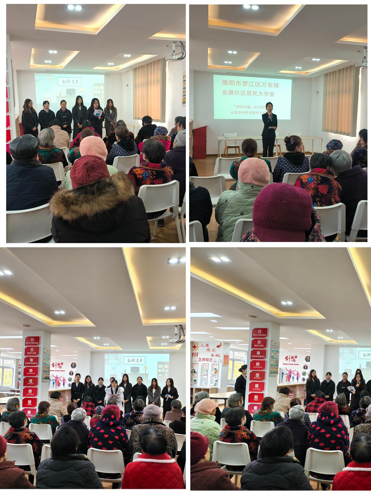 为深入贯彻全国打击整治养老诈骗专项行动部署,切实提升社区老年群体的防诈骗意识与能力,12月17日上午,西南财经大学天府学院“银发数字管家——老年群体智能服务与金融反诈帮扶项目”团队,在教务处老师秦陈荣的带领下,与德阳市罗江区金雁社区携手成功举办了一场以“预防诈骗,安全同行”为主题的宣传教育活动,通过案例讲解、视频展播、情景剧演绎等多元形式,为社区老年人筑起一道坚实的反诈防线。