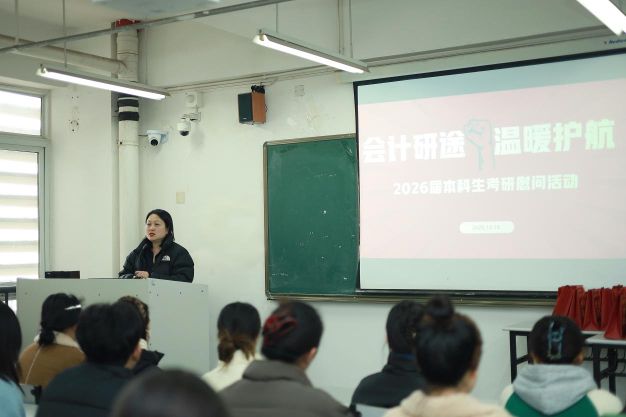 为厚植育人底蕴,凝聚考研冲刺奋进力量,12月18日,会计学院于成都校区(西区)1-503教室举行“会计研途·温暖护航”2026届本科生考研考前慰问活动。会计学院院长陈真子领衔毕业班辅导员团队,面向50名奋战冲刺阶段的考研学生代表,递上满载期许的暖心礼包与深耕教育的真挚祝福,以学院专属的“天府温度”,点燃学子逐梦前行的“研途星火”,为即将到来的研考征程注入强劲精神动能。
