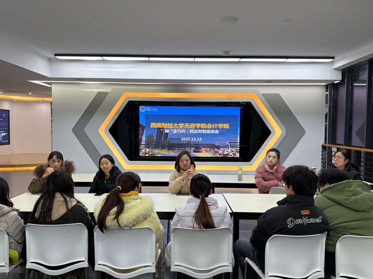 12月23日晚,会计学院在德阳校区C301财务共享中心成功举办“探”企Talk:校企财智座谈会。本次活动邀请到四川西南发展控股集团有限公司财务经理、高级会计师钟小英担任嘉宾,围绕企业财务管理实践等主题,与学院师生展开深入交流。本次座谈会由会计学院杨梦仪主持,会计学院副院长陈茜、许静及部分教师代表出席,数智财经卓越人才创新班、碳管理班等50余名学生共同参与。