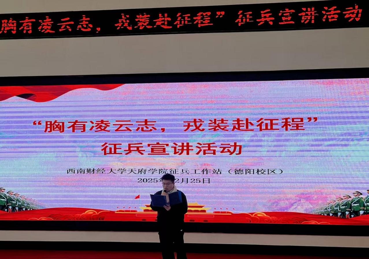 近日,由西南财经大学天府学院征兵工作站组织的“胸有凌云志,戎装赴征程”征兵宣讲活动在德阳校区C203报告厅顺利开展。党委学生工作部副部长严飞雷、学校征兵工作站副站长邱长江、会计学院国防教育负责老师袁海航、康养护理学院国防教育负责老师李婷参加活动。本次活动面向全校学生,围绕征兵政策、军旅生活等内容展开宣讲。