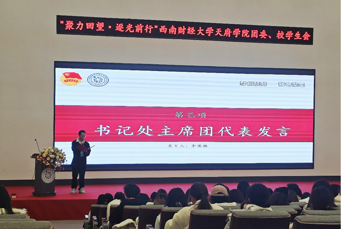岁末将至,收官在即。2025年12月29日,“聚力回望·逐光前行”西南财经大学天府学院团委、校学生会2025年秋季学期工作总结大会在德阳校区C203顺利召开。校团学300余名团学干部、艺术团成员同受邀的会计学院、艺术与传媒学院书记处、主席团代表一同参会。团委副书记车学文,团委心理素质拓展中心指导老师范兴娴,学校心理健康教育中心老师邱长江参加总结会议。