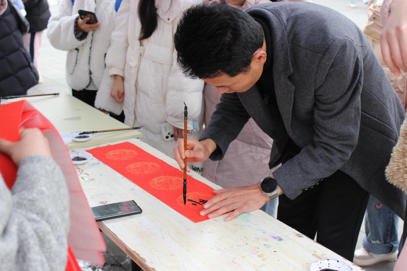 笔墨含情,联语寄心。汉服社与雷锋站联袂,铺展红纸、研墨挥毫。同学们书写“福”字融入百福长卷,亦可借鉴或自创对联,以“书山筑梦”“学海扬帆”等句抒发新年壮志。一横一竖凝祝福,一撇一捺书新愿,让翰墨清香伴随大家共迎春光。