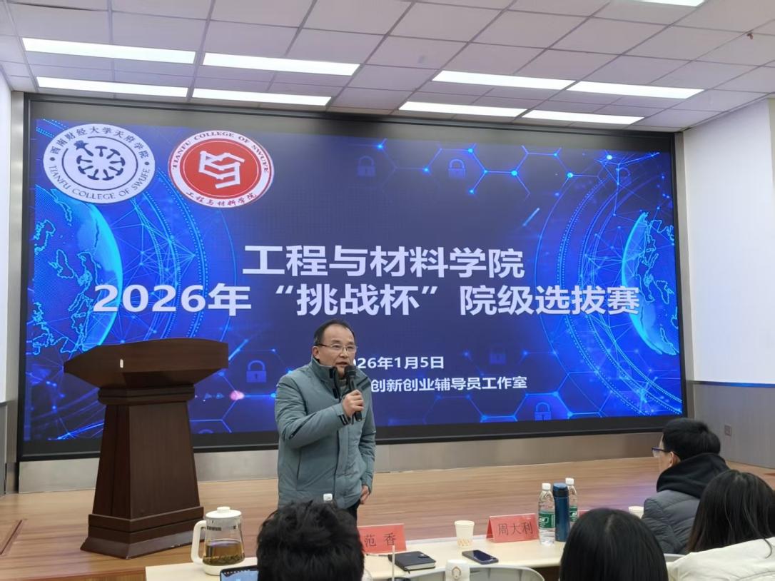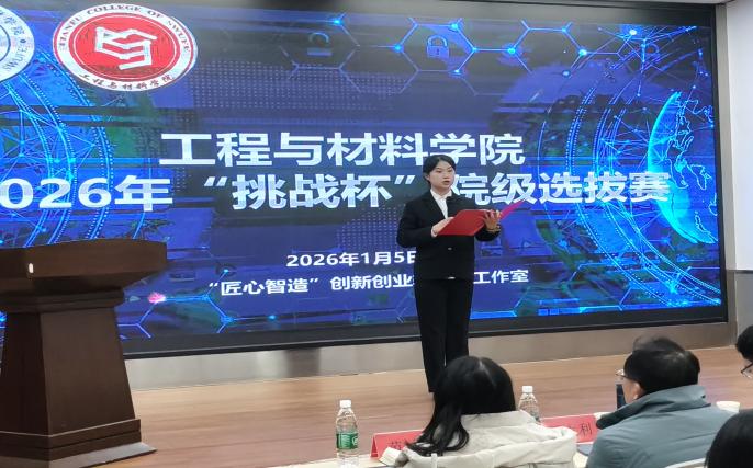 2026年1月5日,工程与材料学院“匠心智造”创新创业辅导员工作室举办了2026年“挑战杯”大学生创新创业大赛院级答辩赛。本次答辩汇集了来自全院各专业的111支团队报名参赛,经过前期严格初审,最终16支优秀团队脱颖而出,进入现场答辩环节,展现了工程与材料学院学子扎实的学术功底、敏锐的创新意识与高度的社会责任感。