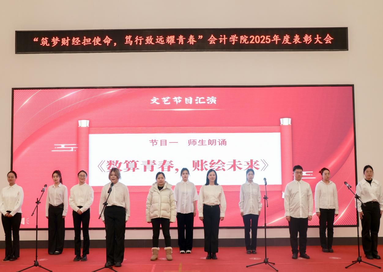 表彰间隙,会计学院艺术团带来了精彩纷呈的文艺表演。诗朗诵《数算青春,账绘未来》以铿锵有力的语调诉说着财会学子的理想与担当,舞姿灵动的团体操《加油amigo》展现了新时代青年的蓬勃朝气,悠扬的合唱《夜空中最亮的星》传递着逐梦路上的热忱与坚定,精彩的演出将现场气氛一次次推向高潮,充分彰显了会计学院师生全面发展的综合素质与昂扬向上的精神风貌。