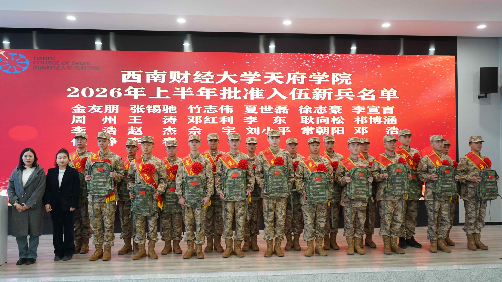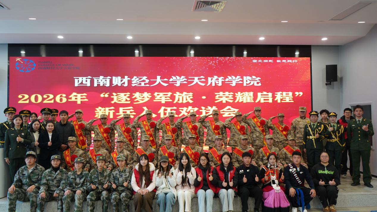 3月18日,西南财经大学天府学院2026年春季“逐梦军旅·荣耀启程”新兵入伍欢送会在绵阳校区顺利举行。学校党委学生工作部副部长颜芳、各二级学院师生代表齐聚现场,为即将奔赴军营的20名新兵送行,共同见证学子从校园走向军营、从青年成长为战士的光荣时刻。