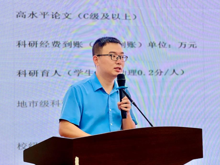 佘脊介绍了学院2025-2026学年的科研工作计划。他提出,本学年学院将以指标为纲、全员参与为原则,通过分类考核、大咖引领等方式推动科研工作的全面发展。佘脊详细分解了科研任务,包括争取科技厅科普项目、国自科、国社科等省部级及以上科研项目,鼓励教师发表高水平论文,提高科研经费到账率等。他还强调了科研平台的作用和学生科研助理的认领工作,以实现科研育人与反哺人培的有机结合。