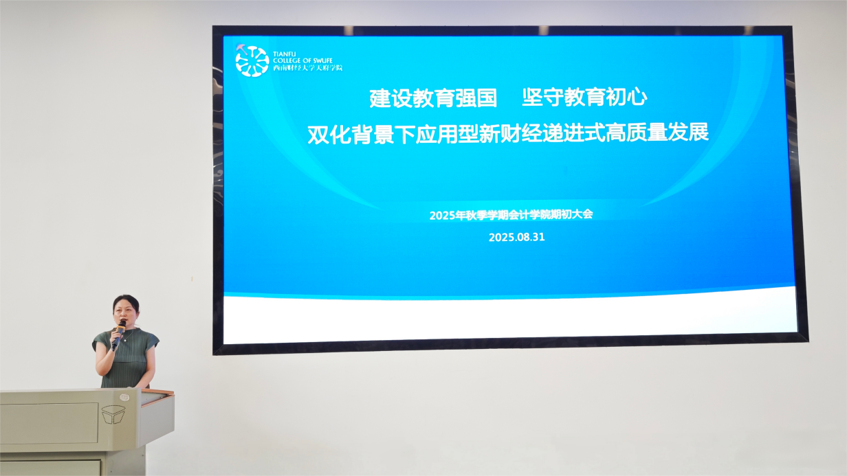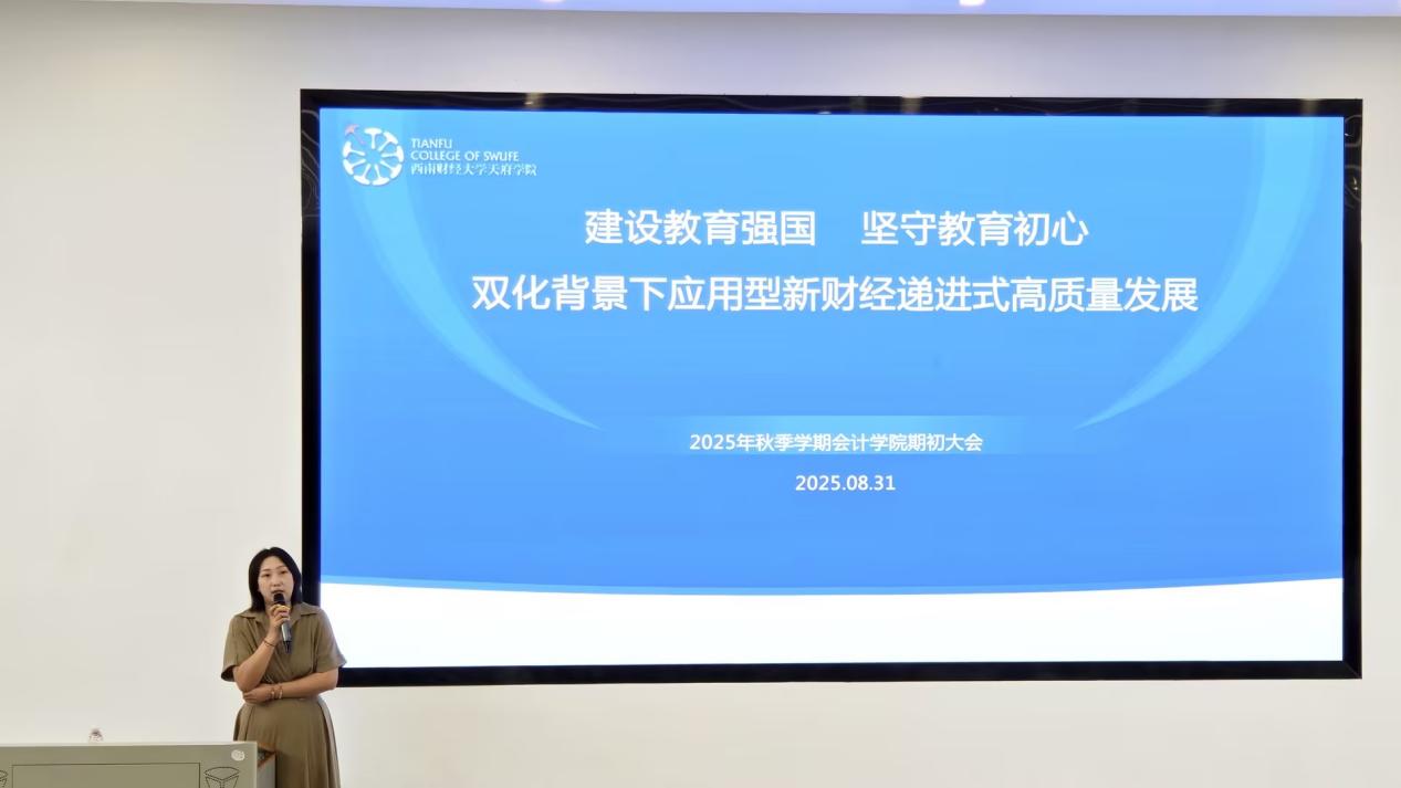 接着,陈真子介绍了会计学院的基本情况和发展历程。她重点阐述了数智化和绿色化“双化”背景下天府新财经递进式发展进程,强调会计学院在党建引领、凝心聚力的引领下,以目标、成果、问题为导向,聚焦“关注学生、关注数据、质量为基、协同推进”,旨在将新财经一张蓝图绘制成现实。她指出人工智能背景下,会计学院将以“大改”“小改”为前期改革示范,本学年在教育教学、党建、学生工作全覆盖全面推进。接下来,她总结了2024-2025学年工作成果,并对学院全体老师对学院发展的支持与付出表示感谢,最后,对新学年工作任务进行了说明和部署,新学年,希望全体教师能够持续秉持敬业精神,共同推动学院教育事业的进一步发展。