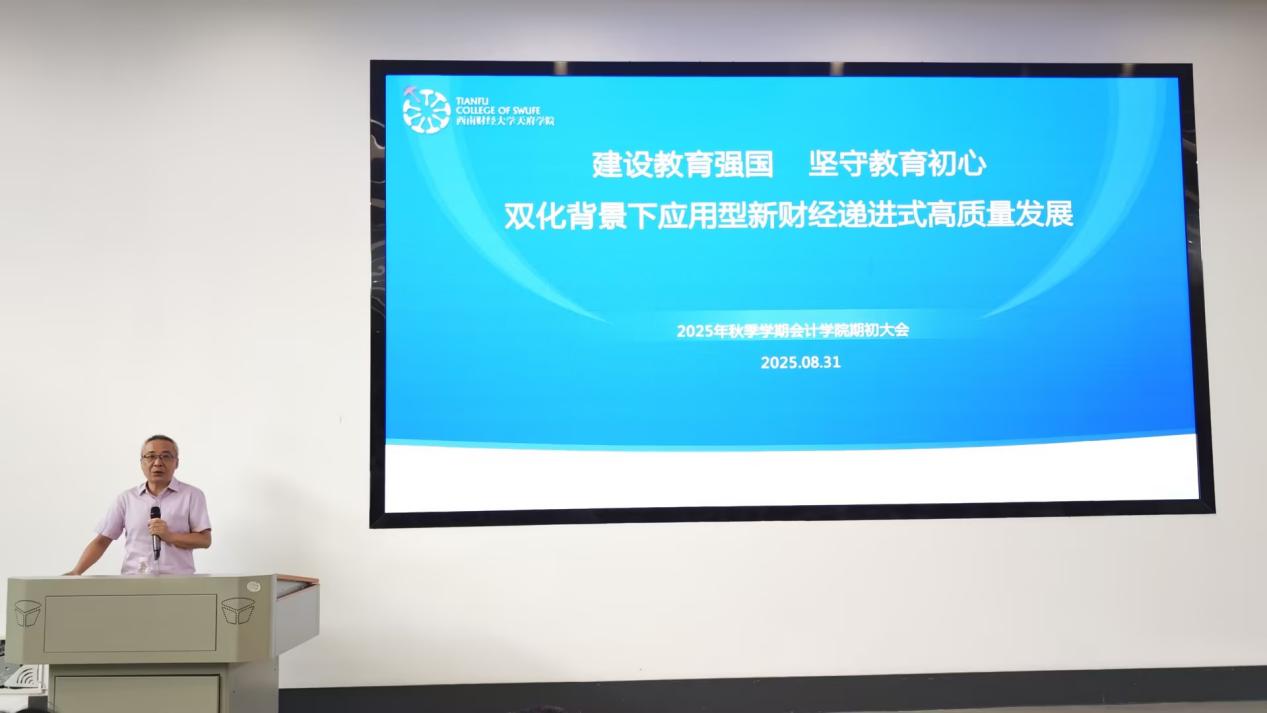 8月31日上午,会计学院在德阳校区B301报告厅召开全体教职工期初工作会议。西南财经大学天府学院副校长张之明、校长助理高亮参会,四川省经济学与财政学教学指导委员会秘书长、西南财经大学财税学院刘蓉教授受邀出席,会计学院院长陈真子主持会议。会议围绕“建设教育强国,坚守教育初心,双化背景下应用型新财经递进式高质量发展”主题,讨论人工智能背景下的教育变革和学院发展,总结过去一学年工作成果,规划新学年工作重点。