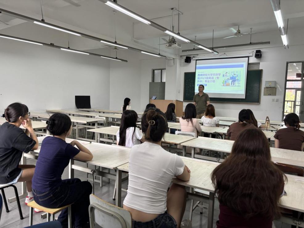 会议开始,周忠杰首先为专升本学生系统介绍了学校英语专业的三大方向分组,并围绕创新班的创办背景、核心目标及多元优势进行了深入解读。他强调,创新班致力于打破传统英语教学模式,融合新媒体技术与跨文化传播能力,旨在培养具备英语专业素养和实践能力的复合型人才。