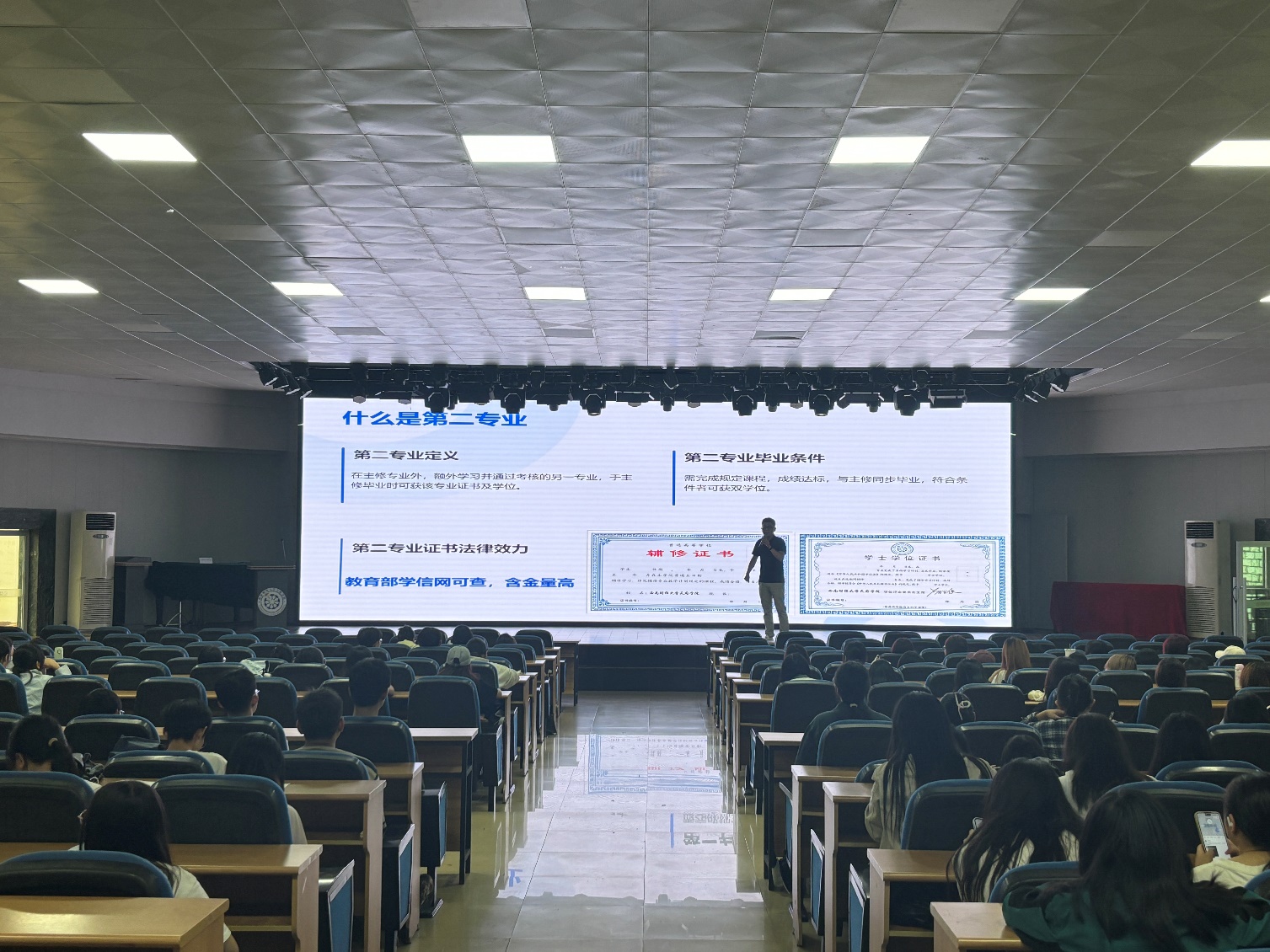 为适应社会快速发展对复合型人才的需求,拓展学生视野与就业竞争力,9月5日中午,学院组织全体2024级学生在学校学术报告厅参加了由学校招生就业处副主任胥涛主讲的第二专业宣讲会。