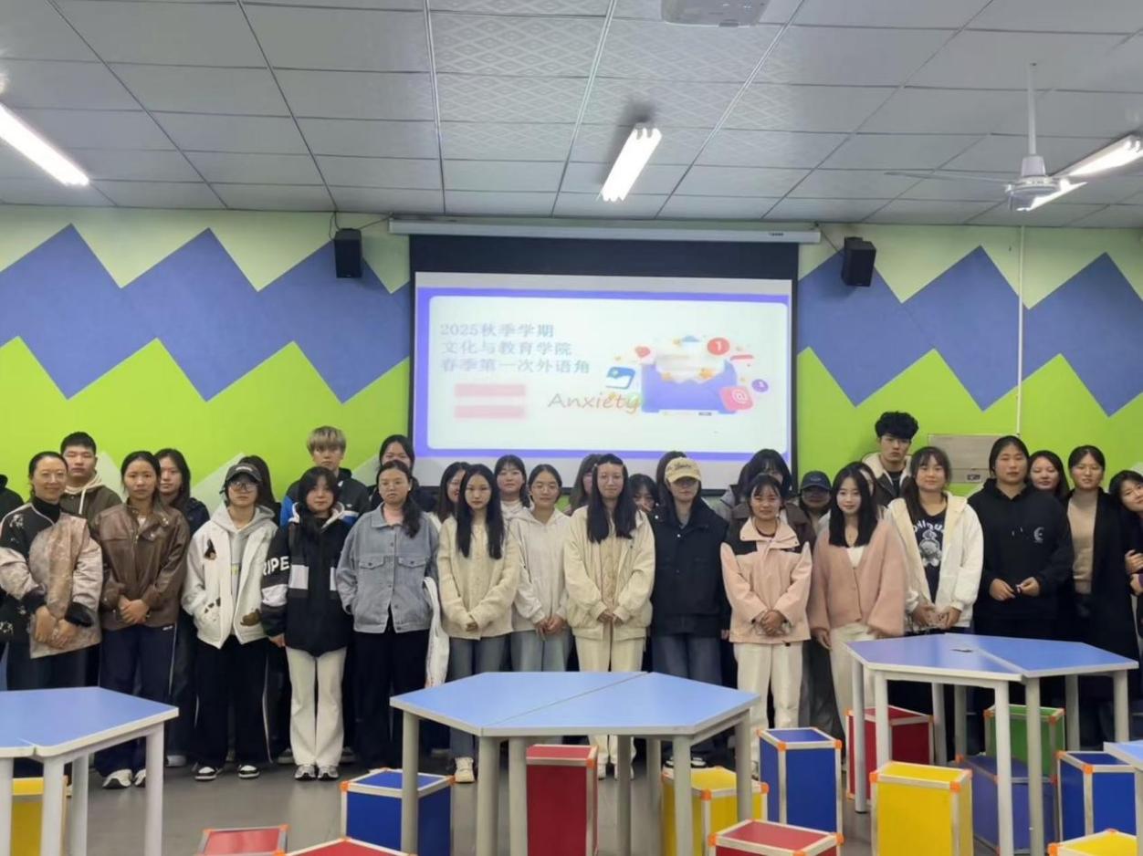 为丰富校园文化生活、激发学生英语学习热情,10月22日晚,文化与教育学院在三教声乐室开展了2025年秋季学期第七周外语角活动。本次活动以“anxiety”为主题,特邀蓝金燕老师现场指导,2024 级英语专业学生周洁西主持,吸引了文化与教育学院及体育学院部分学生参与。
