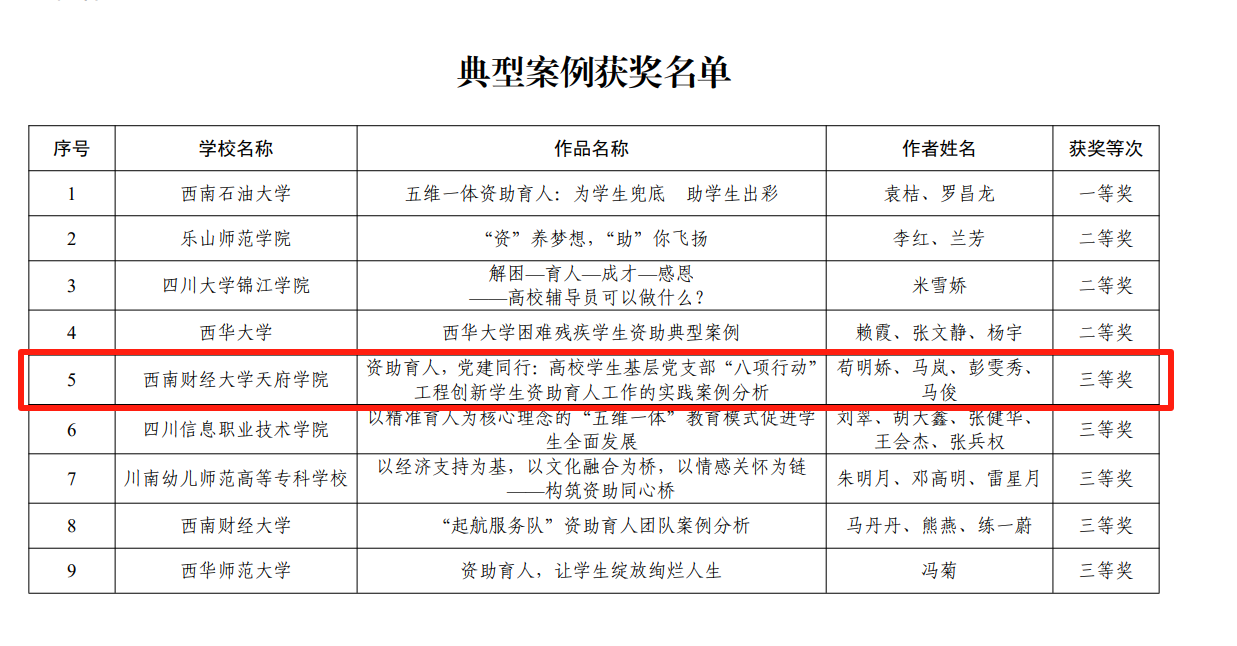 在四川省首届高校学生资助工作优秀论文典型案例评选中,由学院教师苟明娇、马岚、彭雯秀、马俊共同完成的案例《资助育人,党建同行:高校学生基层党支部“八项行动”工程创新学生资助育人工作的实践案例分析》荣获三等奖。该案例以“资助育人,党建同行”为核心理念,构建“学、谈、践、带、研、创、服、评”八维一体的资助育人体系,通过精准识别困难学生,系统开展学业帮扶、心理关怀、社会实践等多元行动,有效提升了学生的综合素质与发展能力。该模式以学生基层党支部为组织载体,将党建与育人深度融合,形成了党建引领下可复制、可推广的资助育人新路径,为资助工作提供了具有参考价值的实践范例。