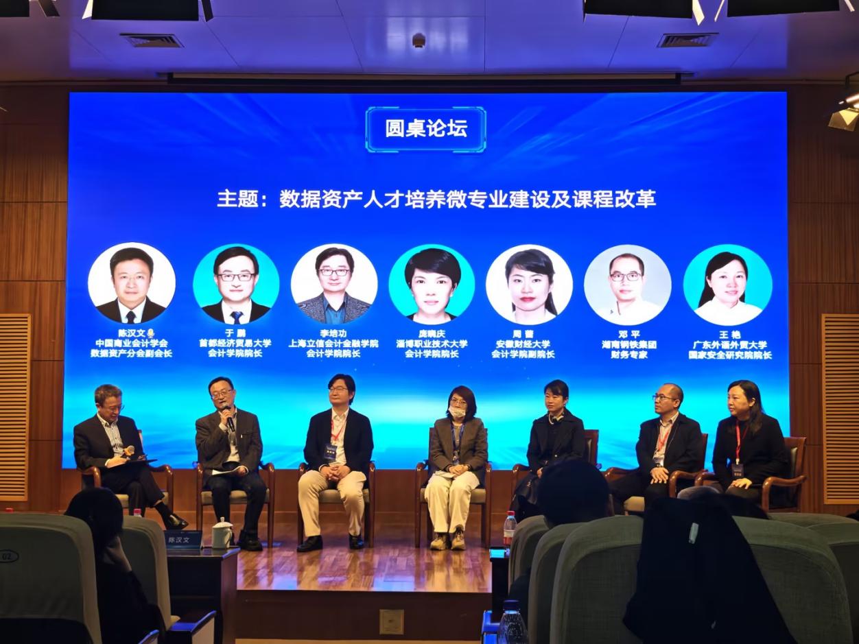 主题报告后,中国商业会计学会数据资产分会副会长、南京审计大学教授陈汉文主持圆桌论坛,首都经济贸易大学会计学院院长于鹏、上海立信会计金融学院会计学院院长李培功、淄博职业技术大学会计学院院长庞晓庆、安徽财经大学会计学院副院长周蕾、湖南钢铁集团财务专家邓平、广东外语外贸大学国家安全研究院院长王艳等嘉宾,围绕“数据资产人才培养微专业建设及课程改革”展开热烈讨论,形成多项兼具理论价值与实践意义的共识。
