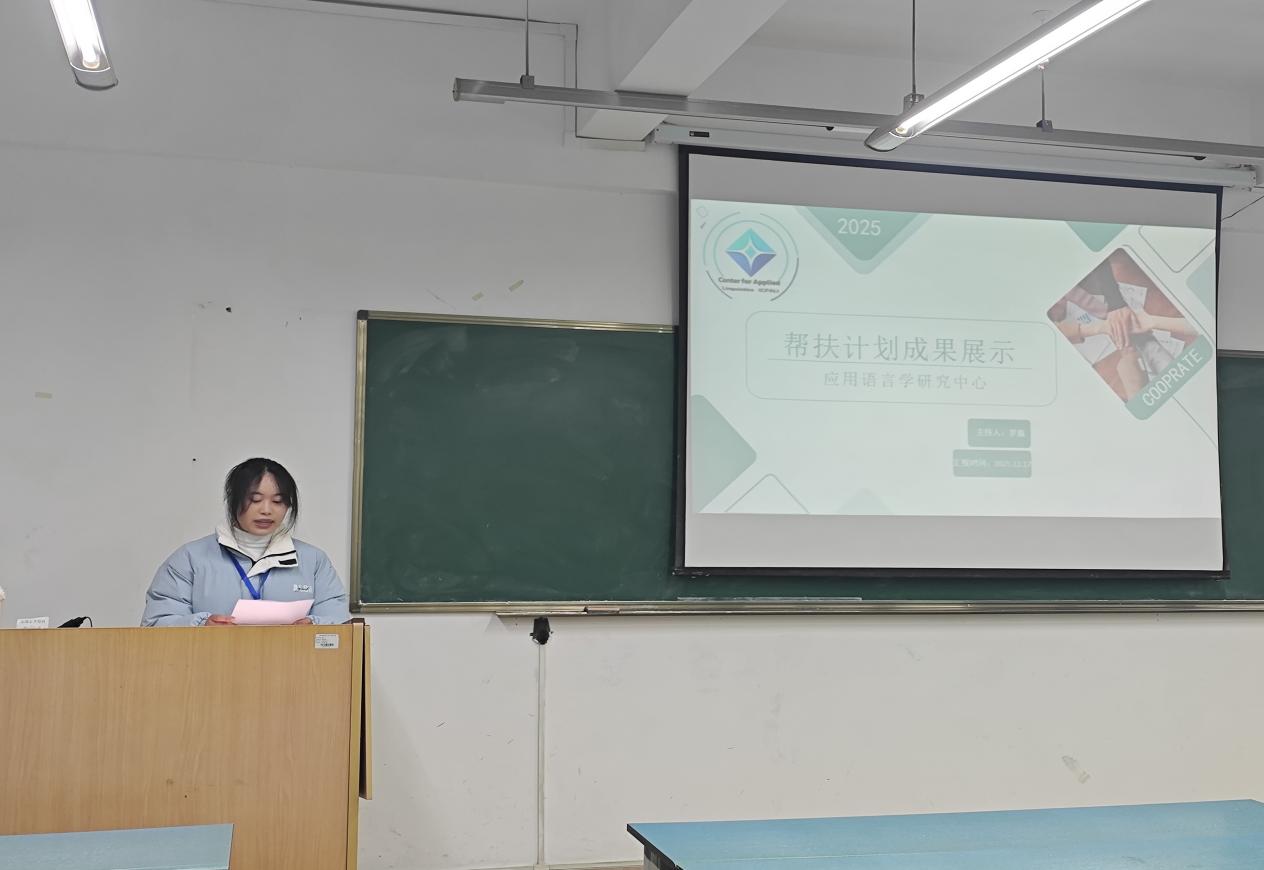 为检验英语帮扶计划实施成效,搭建交流展示平台,12月17日,文化与教育学院应用语言学中心英语帮扶计划成果汇报会在三教3214教室顺利举行。语言文学系系主任周忠杰、应用语言学中心主任郭家宏出席,科研助理罗鑫、钟迁讯主持会议,学生助理李勇豪、杨昊、简悦、兰昊成等参与现场组织工作。科研助理王烁讲解英语帮扶计划。