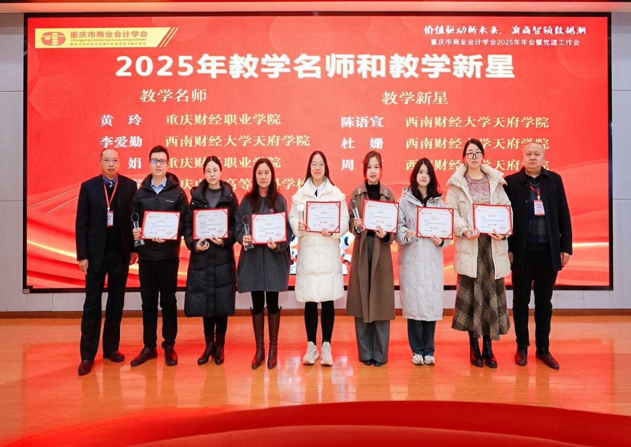在颁奖仪式环节,大会公布并颁发了年度教学名师、教学新星等多项荣誉证书及奖杯。西南财经大学天府学院教师李爱勤凭借深厚的教学功底、丰富的教学经验与突出的教学成果,获评“教学名师”;陈语宣、杜姗、周巧三位老师则因在教学创新、课程设计及人才培养方面的亮眼表现,荣获“教学新星”奖项,充分彰显了学院在会计专业师资队伍建设与教学质量提升上的显著成效。