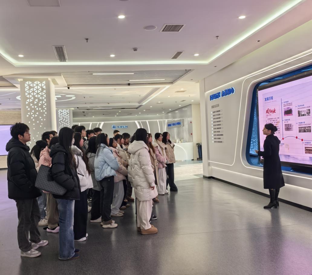 在展示中心专业讲解人员的引导下,师生们有序参观了综合形象展区的三大主题板块。在“回望历程 永葆初心”展区,通过历史实物、图文资料与数据图表,系统了解了九洲集团67年来的发展历程、产业布局与改革创新成就,深刻感受到企业坚守初心、持续奋斗的发展脉络。在“专业专注 创新驱动”展区,重点展示了电子系统装备、通信智能终端、软件数据智能、高端元器件、汽车电子装备等五大产业领域的核心产品与关键技术。通过实物展示、技术解析与场景模拟,师生们对九洲在自主创新、技术攻关方面的成果有了直观认识。在“党建引领 筑梦前行”展区,则展现了企业将党的建设融入发展战略、人才培养与生态构建的实践路径,呈现了高质量党建引领高质量发展的生动案例。