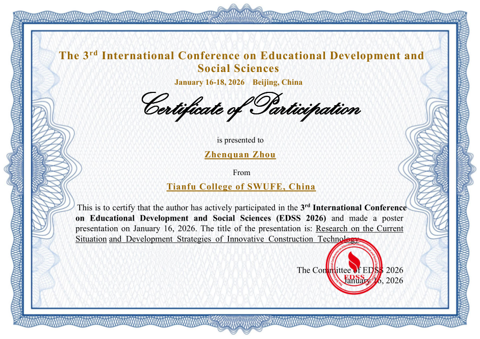 近日,第三届教育发展与社会科学国际学术会议(EDSS 2026)近日在北京顺利召开。本次大会由华东师范大学和马来亚大学等多所世界知名高等学府进行学术支持,旨在为从事教育与社会科学研究的专家学者提供一个共享科研成果和前沿技术的平台。工程与材料学院教师周桢佺博士受邀参会并就“创新施工技术现状及发展策略研究”的相关课题内容在本届大会进行了学术交流及海报展示,受到了业内学者和专家的高度肯定。