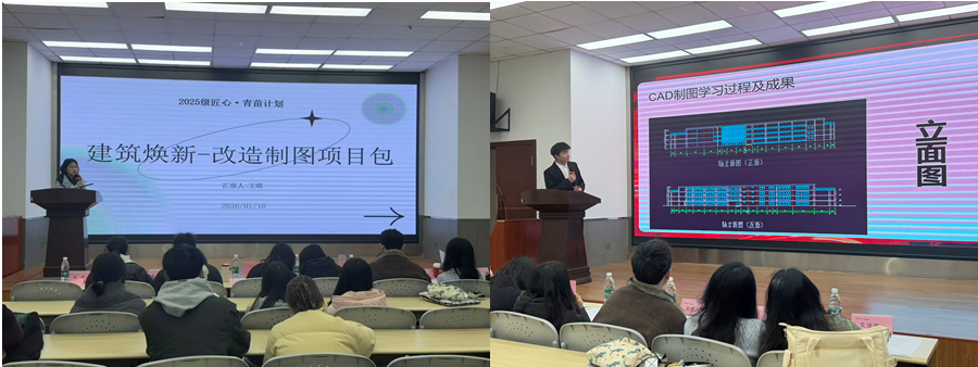 在本次答辩会中,“建筑焕新-改造制图包”团队的汇报率先拉开帷幕。来自2025级匠心·青苗计划的邓森元和王晴同学分别代表团队对某教学楼改造制图进行了汇报,介绍了项目概况、改造要求、制图要点。点评专家范璐瑶老师和陈鹏冲博士分别肯定了其内容的完整性和逻辑性,建议改造方案设计时要考虑建筑类型,结合不同类型建筑完善改造细节。