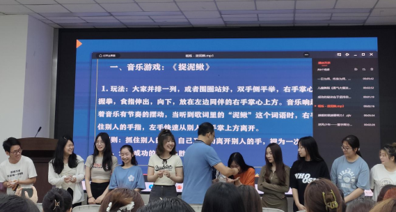 讲座中,宋文璠从入园环节、离园环节、进餐环节、盥洗环节、饮水环节、做操环节、午睡环节、教学环节、游戏环节等多方面对学前教育相关知识进行了详细讲解,在讲述之余,她带领各位同学体验了《抓泥鳅》音乐活动。