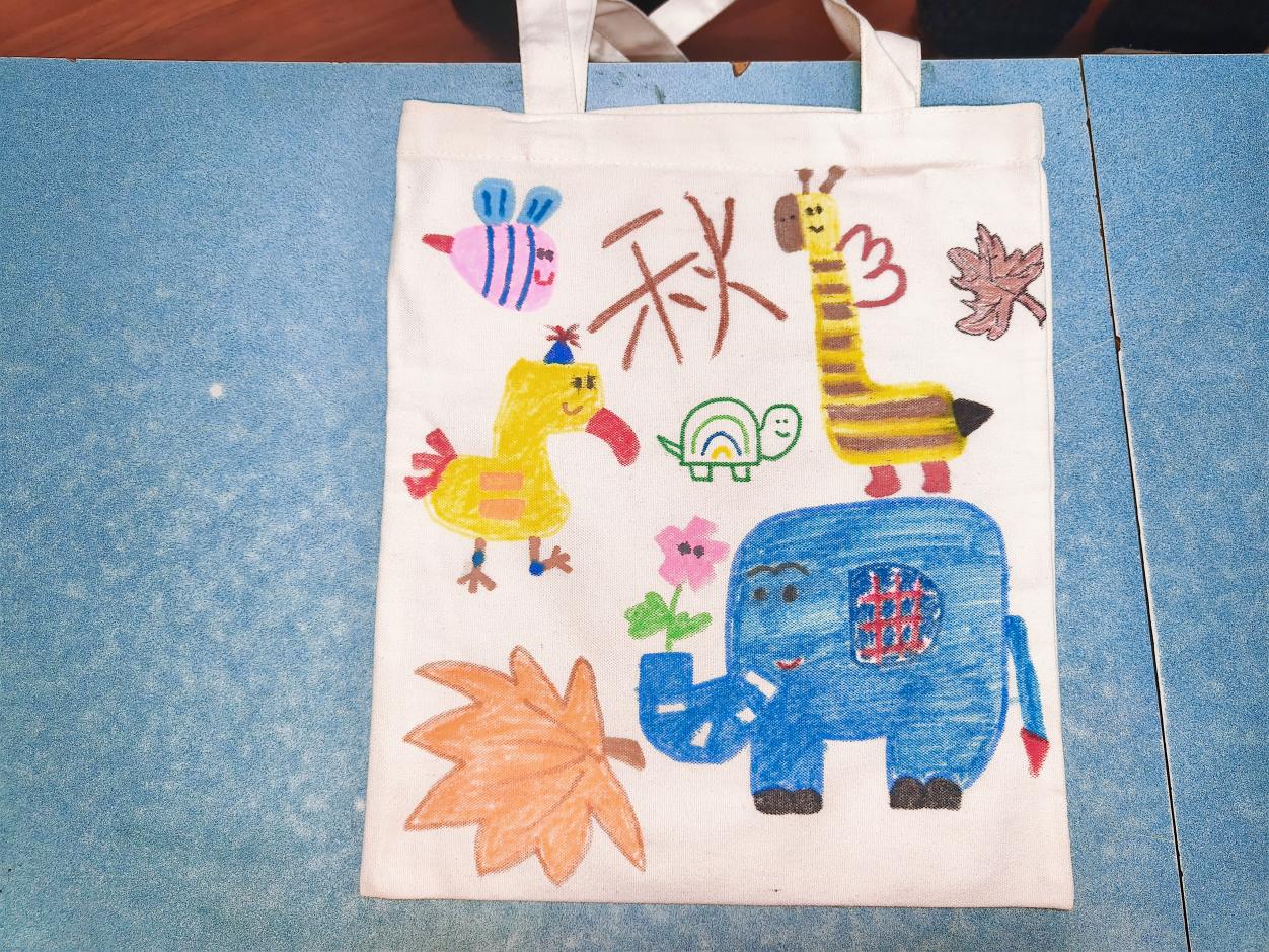 本次活动以帆布包手绘为核心环节。同学们四人一组,在限时条件下协同创作。作品中,秋日主题通过明快的色彩搭配生动呈现:小动物以饱满色块与简洁线条勾勒,灵动可爱;枫叶、花卉等季节元素点缀其间,手写“秋”字更烘托出浓浓氛围。整体风格童趣鲜活,既贴合帆布包作为日常载体的实用属性,也体现了创作者丰富的想象力与活泼的审美表达。活动尾声,同学们手持亲手绘制的帆布包合影展示。画面中的“秋”字与图案相映成趣,轻松笑意间流露着对作品的珍爱,也为现场增添了生动温暖的秋日气息。