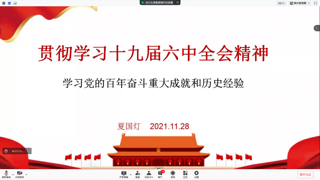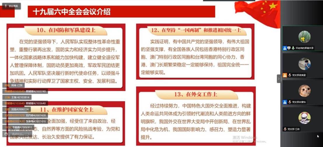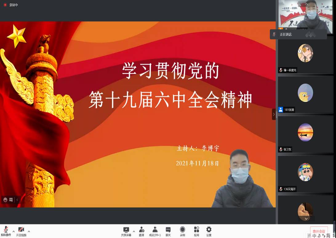 中国共产党第十九届中央委员会第六次全体会议,于11月11日在北京胜利闭幕,这是一次具有里程碑意义的重要会议。11月18日中午,为继续深入学习第十九届六中全会精神,西南财经大学天府学院会计学院第二党支部于线上开展以“学习贯彻党的第十九届六中全会精神”为主题的十一月主题党日学习活动。会计学院第二党支部全体师生党员及积极分子参与本次学习。十一月主题党日主题学习伊始,主持人李博宇以《中共中央关于党的百年奋斗重...