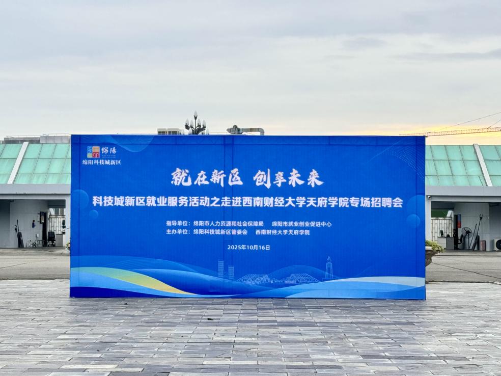 正值“金九银十”毕业生求职关键期,为深入贯彻落实党中央、国务院和教育部决策部署,抢抓秋招关键期,发挥校园招聘主渠道作用,助力2026届毕业生更加充分高质量就业,10月16日,由绵阳市人力资源和社会保障局、绵阳市就业创业促进中心主办,西南财经大学天府学院就业指导中心与绵阳科技城新区管委会联合举办的“就在新区·创享未来”科技城新区就业服务活动之走进西南财经大学天府学院专场招聘会在天府学院绵阳校区光华广场顺利举办。