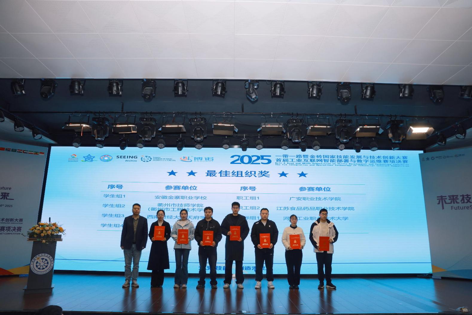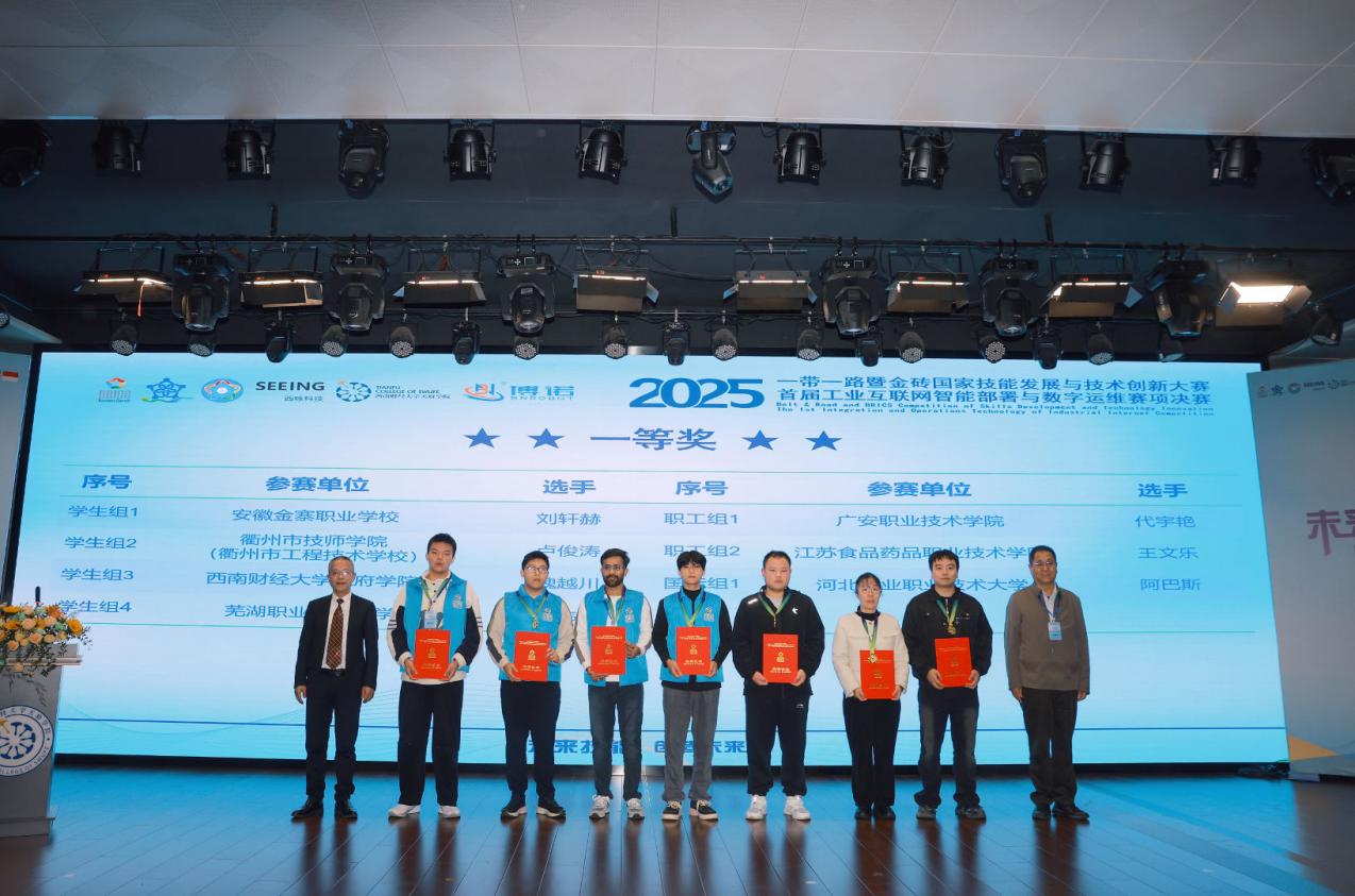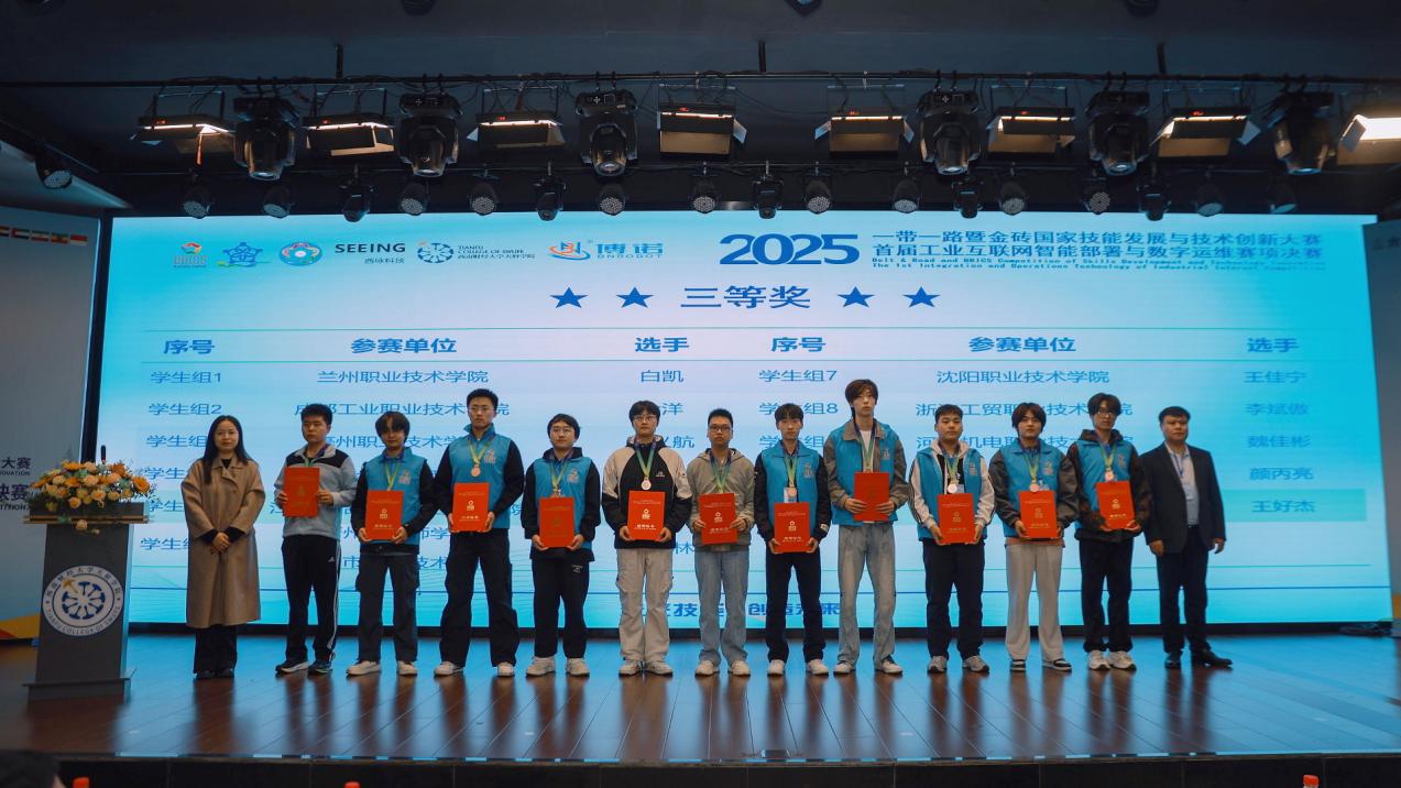 11月10日,2025“一带一路”暨金砖国家技能发展与技术创新大赛之首届工业互联网智能部署与数字运维赛项决赛闭幕式暨颁奖仪式在西南财经大学天府学院举行。经过2天的激烈角逐,来自国内外多所院校及单位的参赛选手圆满完成所有赛程,各大奖项全部决出。