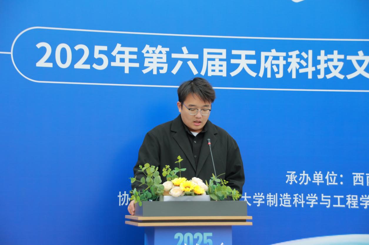 学生代表鲜明从青年视角分享了对科技文化的理解,感谢学校搭建了这么好的平台,同时也祝愿所有参赛团队都能在交流中收获成长。他呼吁同学们用手中的技术、心中的热爱,在“AI共生 数绘天府”的路上,继续勇往直前。