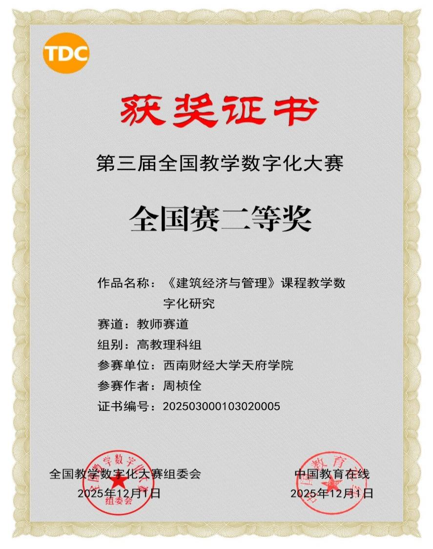 为深刻领会加快推进教育数字化的重大战略意义,增强推进教育数字化工作的责任感使命感,坚定推进教育数字化战略的信心和决心,由中国教育在线面向全国高校教师举办的第三届全国教学数字化大赛在近期已圆满完成。西财天府学院工程与材料学院低空经济系主任周桢佺教学成果《建筑经济与管理课程教学数字化研究》在本届大赛高教理科组的作品评选中取得全国二等奖的佳绩。