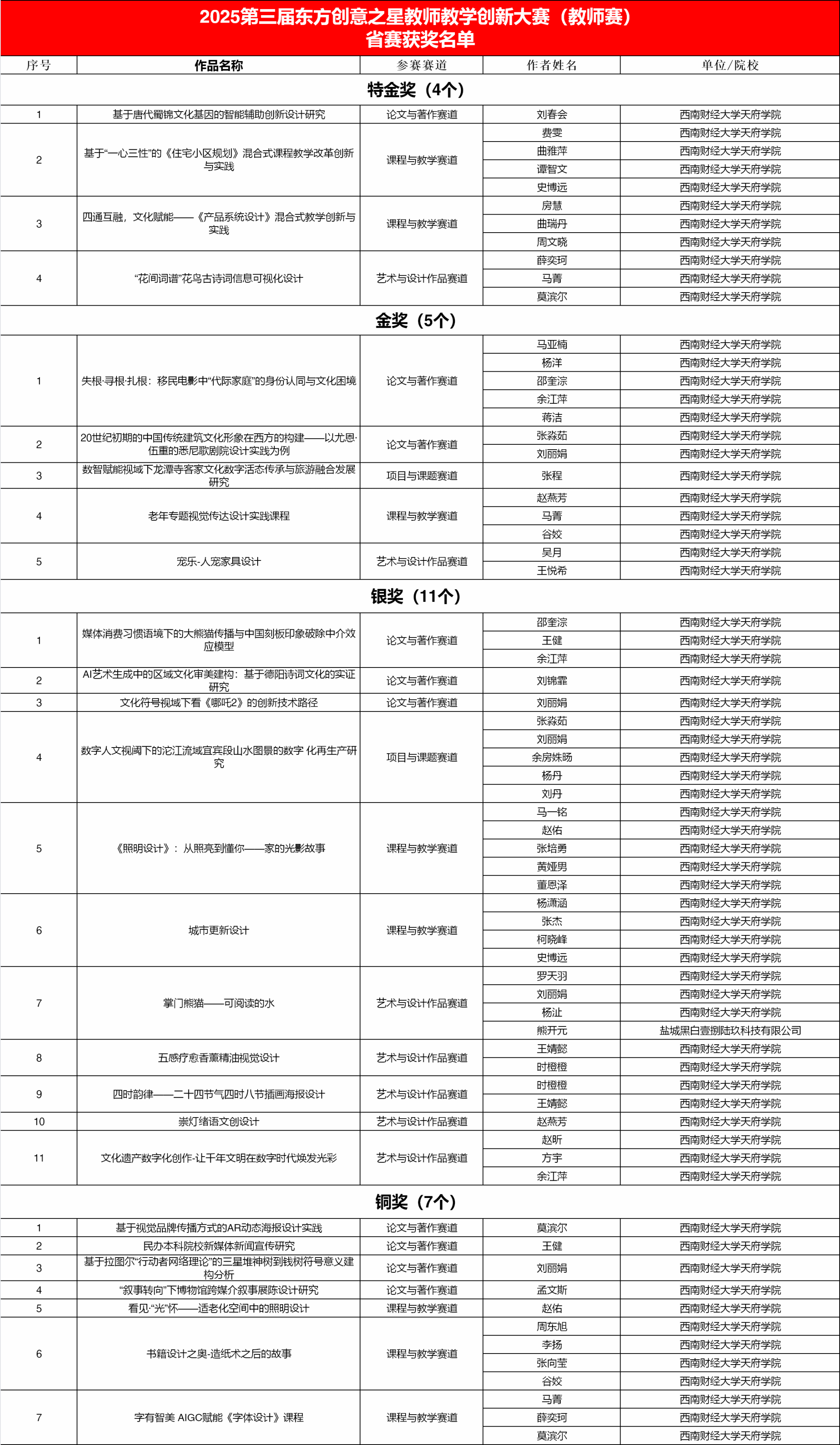 2025第三届东方创意之星教师教学创新大赛(教师赛)国赛获奖名单于近日公告出炉,西南财经大学天府学院艺术与传媒学院积极参赛,最终荣获金奖2项,银奖3项,铜奖4项,省赛(四川赛区)特金奖4项,金奖5项,银奖11项,铜奖7项。