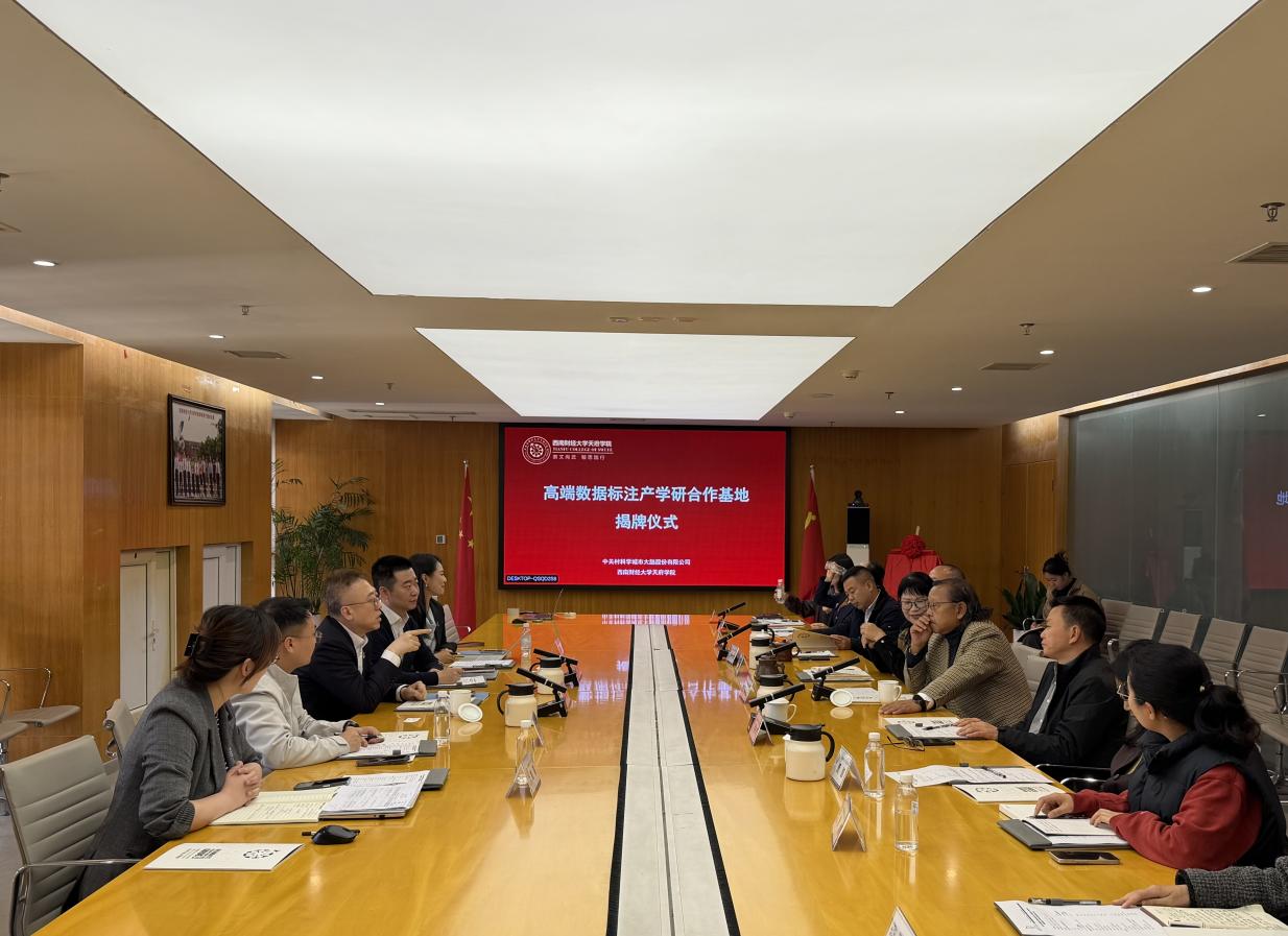 3月26日下午,西南财经大学天府学院与中关村科学城城市大脑股份有限公司(以下简称“中科大脑”)高端数据标注产学研合作基地揭牌仪式在学校成都校区(西区)举行。中科大脑总裁李浩浩、副总裁刘晨曦、营销总监巫桂香、行业总监陈枭、北京中科智媒融媒体技术有限公司运营总监姚蓉,学校校长蒲果泉,党委书记、省政府督导专员韩秀英,副校长姚一永、苟兴才,校长助理蔡松伯共同出席主持。仪式由产教融合中心主任王钰主持。