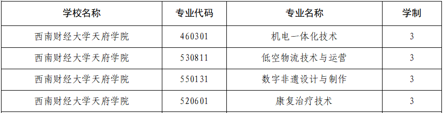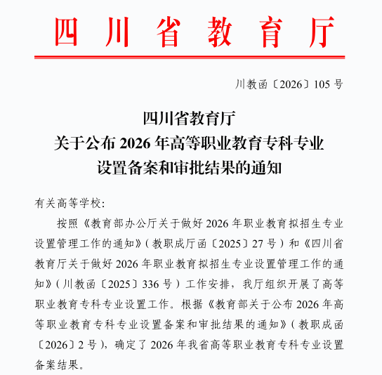 近日,四川省教育厅发布《关于公布2026年高等职业教育专科专业设置备案和审批结果的通知》。西财天府学院申报的机电一体化技术、低空物流技术与运营、数字非遗设计与制作、康复治疗技术4个专业全部通过审批,计划于2026年秋季正式招生。同时,学校主动停招9个专业,以优化专业结构,提升资源配置效率。