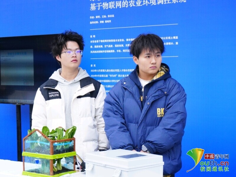 图为同学们搭建的基于物联网技术的农业环境监控系统,以及展示的小白菜监控模型。通讯员 李馥君