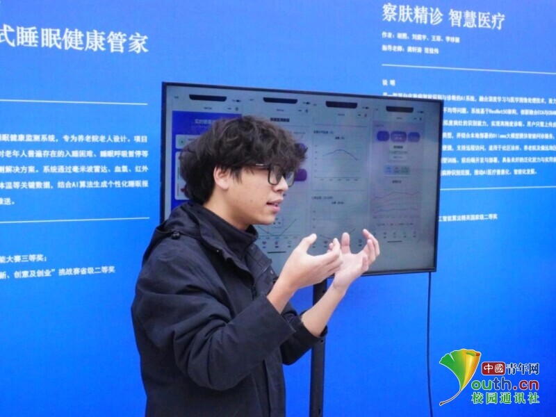 图为同学为嘉宾介绍无接触式睡眠监测系统。李馥君 供图