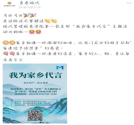 “举头望明月,低头思故乡”,我们的那一份份乡愁,就如《静夜思》中的明月眷念大地一般,家乡是我们魂牵梦绕的精神家园,承载着我们美好的回忆。为了让大家更好地表达对家乡的思念与眷恋,积极分享家乡的美景美食,弘扬家乡文化,现代服务管理学院于5月19日至5月22日通过线上举行“我为家乡代言”主题活动。